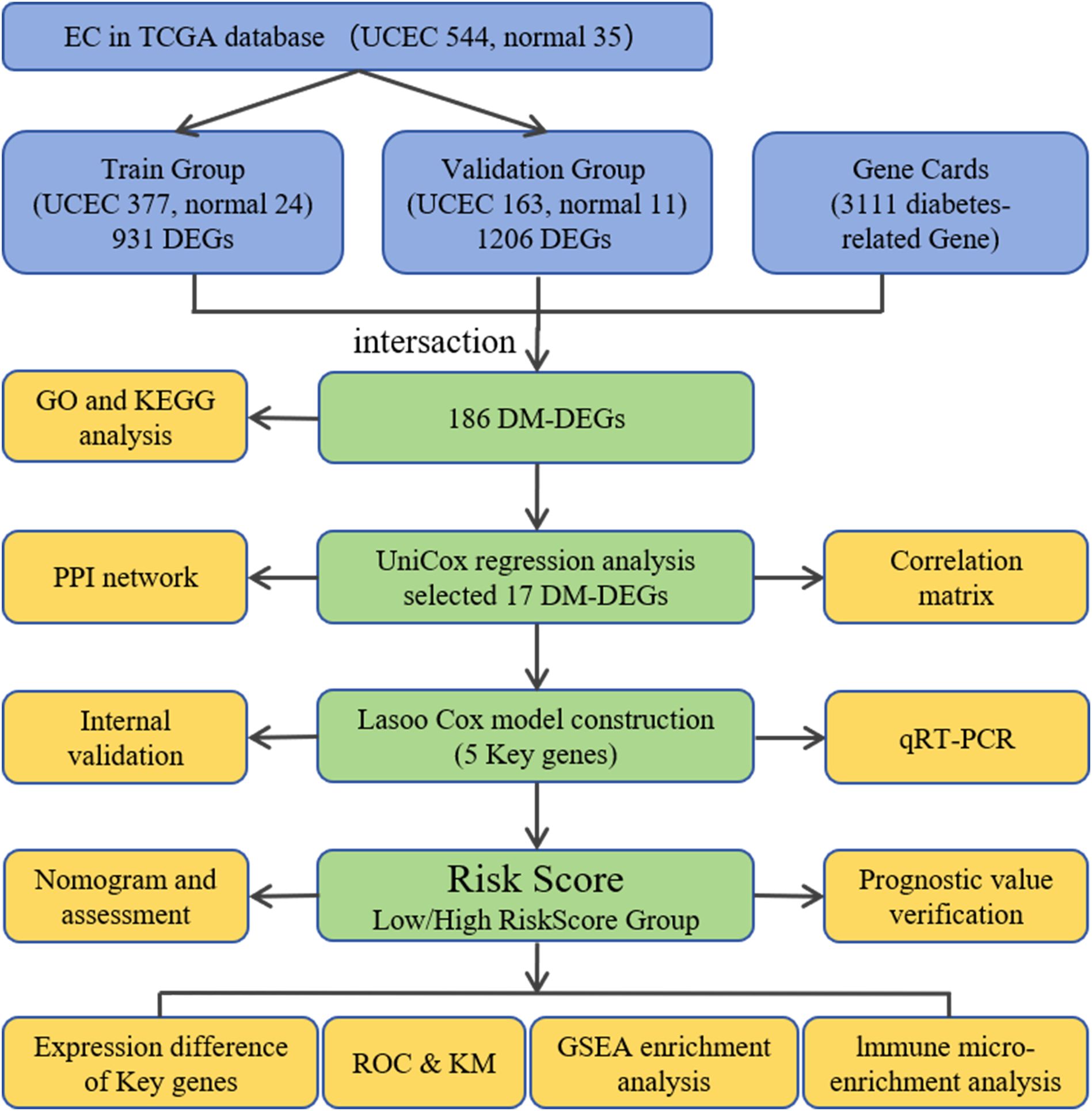Flowchart illustrating the analysis process of EC in the TCGA database. The chart begins with data from training and validation groups, and gene cards, identifying 186 DM-DEGs. These undergo GO and KEGG analysis, PPI network analysis, UniCox regression to identify 17 DM-DEGs, and Lasso Cox model construction to focus on five key genes. The process involves generating a risk score, which is assessed through multiple analyses, including qRT-PCR, ROC & KM, GSEA enrichment, and immune micro-enrichment, alongside correlation matrix and prognostic value verification.
