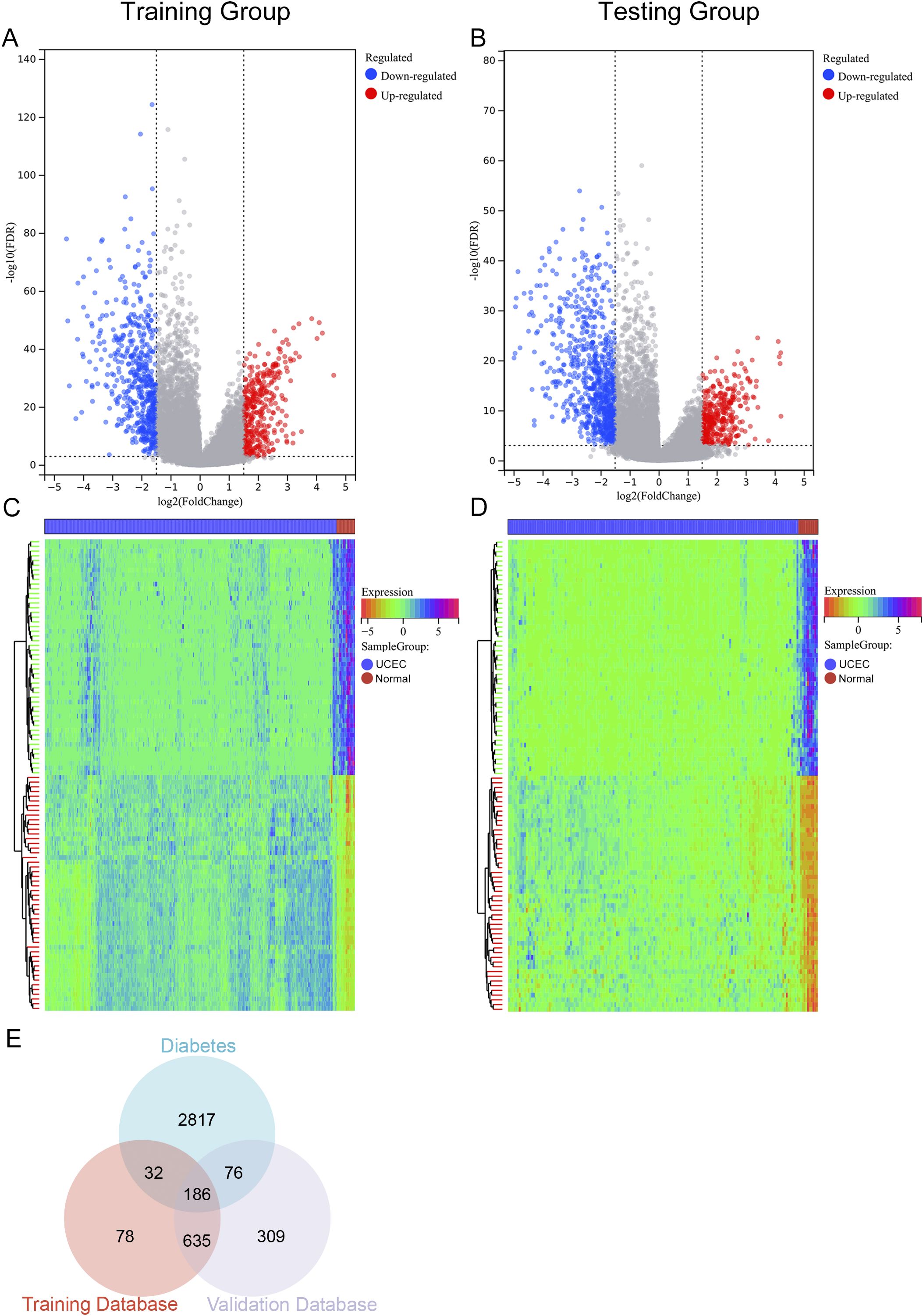 Figure 2. Volcano plot, heat map, and Venn diagram. (A, B) The volcano plots for the Training group and Testing group, with upregulated genes represented in red and downregulated genes in blue. (C, D) The heat maps for the Training group and Testing group. (E) Venn diagram illustrating overlapping genes from both groups and the diabetes database.