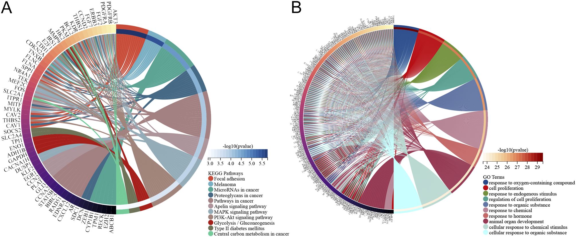 Circular diagrams labeled A and B represent gene and pathway interactions. Diagram A shows KEGG pathways such as melanoma and focal adhesion. Diagram B shows GO terms like cell proliferation and response to stimulus. Lines connect outer labels to inner segments, indicating associations. Color gradients depict p-values.