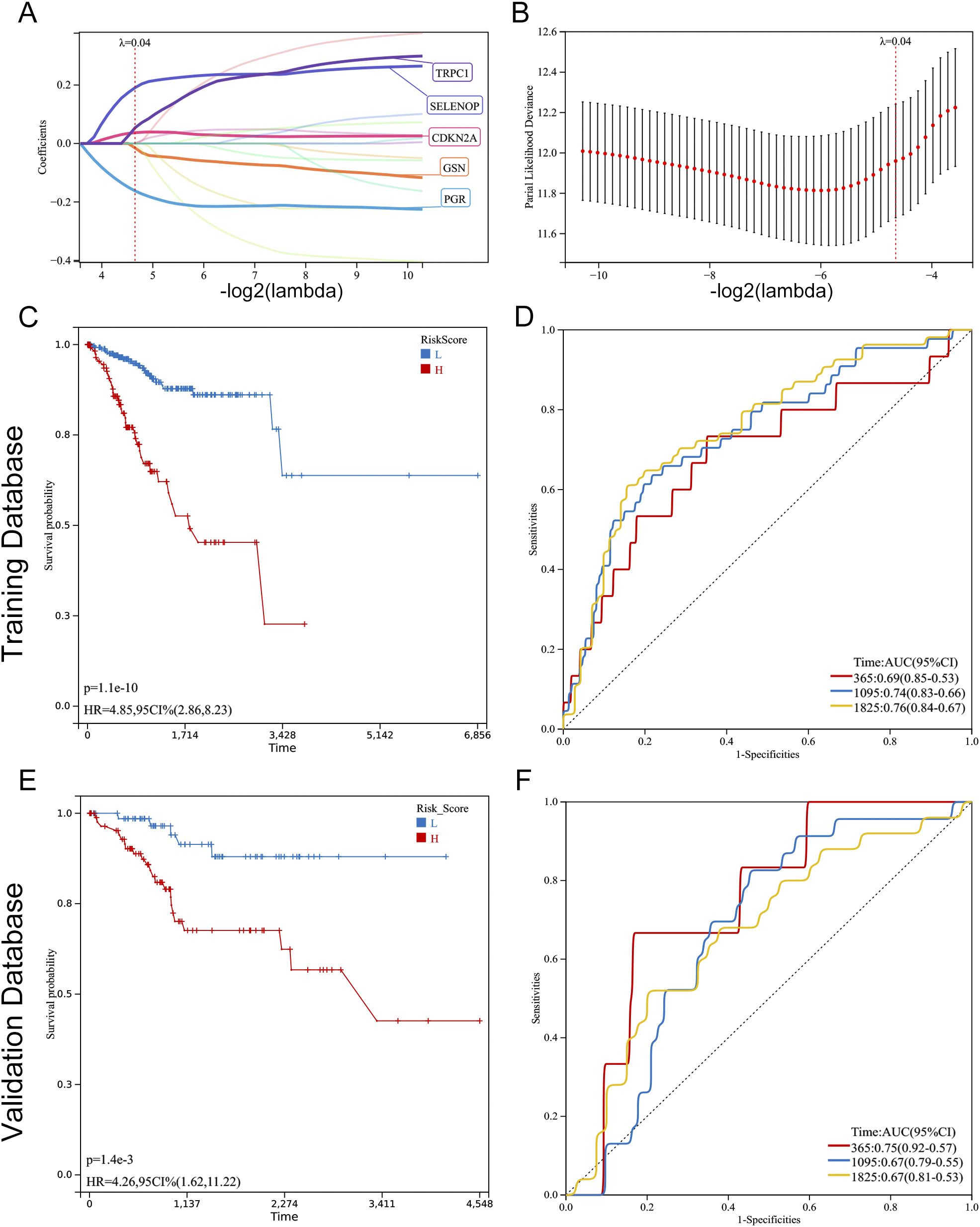 Panel A shows coefficient profiles for genes with LASSO regression, highlighting TRPC1 and SELENOP among others. Panel B is a plot of partial likelihood deviance versus lambda, indicating an optimal value at lambda equals 0.04. Panel C displays a Kaplan-Meier survival curve for a training database, distinguishing high and low risk scores. Panel D depicts receiver operating characteristic (ROC) curves for the training database with different time points. Panel E presents another Kaplan-Meier survival curve for a validation database. Panel F shows ROC curves for the validation database at similar time points.