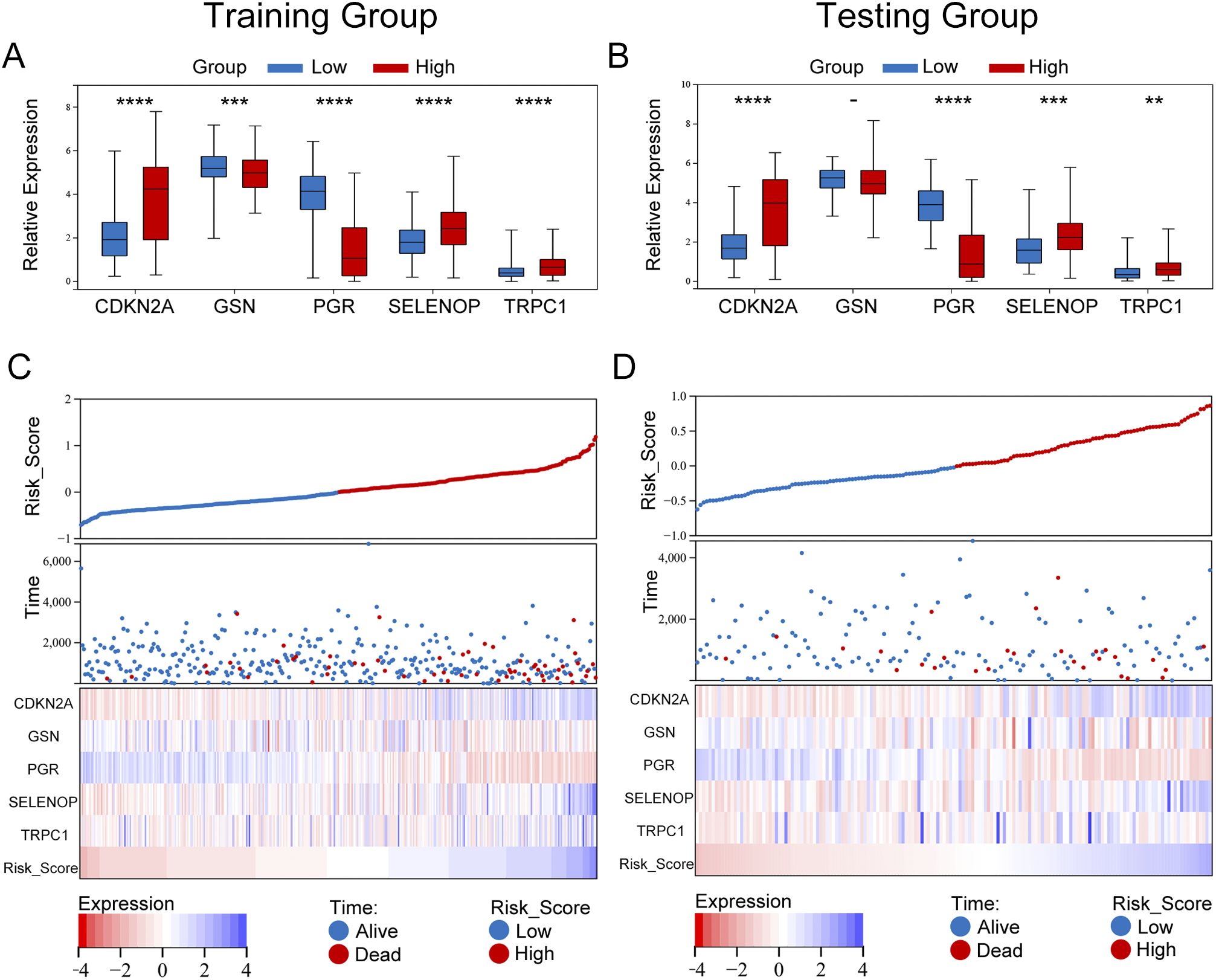 Box plots and heatmaps illustrate gene expression and risk scores for training and testing groups. Panels A and B compare low and high expression of CDKN2A, GSN, PGR, SELENOP, and TRPC1. Panels C and D display risk scores and survival data, with heatmaps showing gene expression levels for corresponding risk scores. Blue and red denote low and high groups, respectively, and living versus deceased status is indicated by blue and red dots. Statistical significance is marked with asterisks.