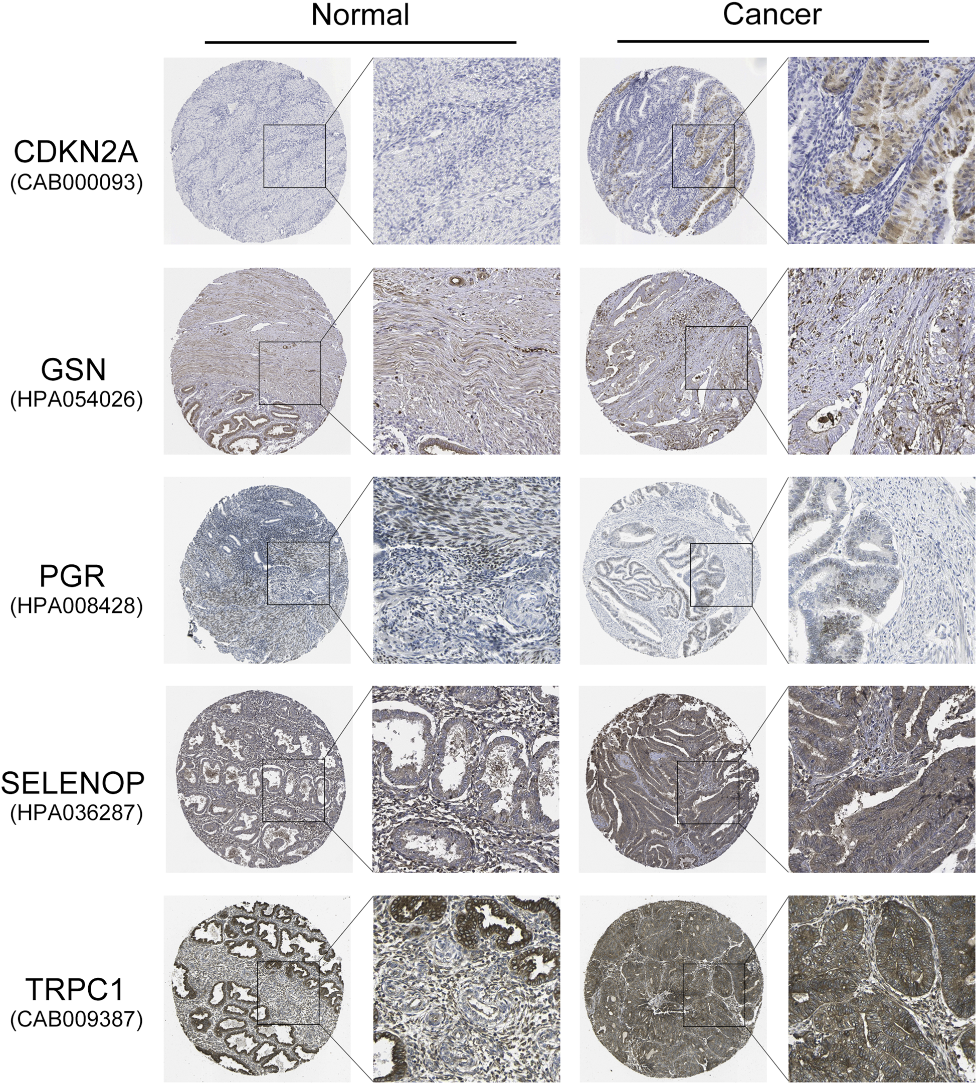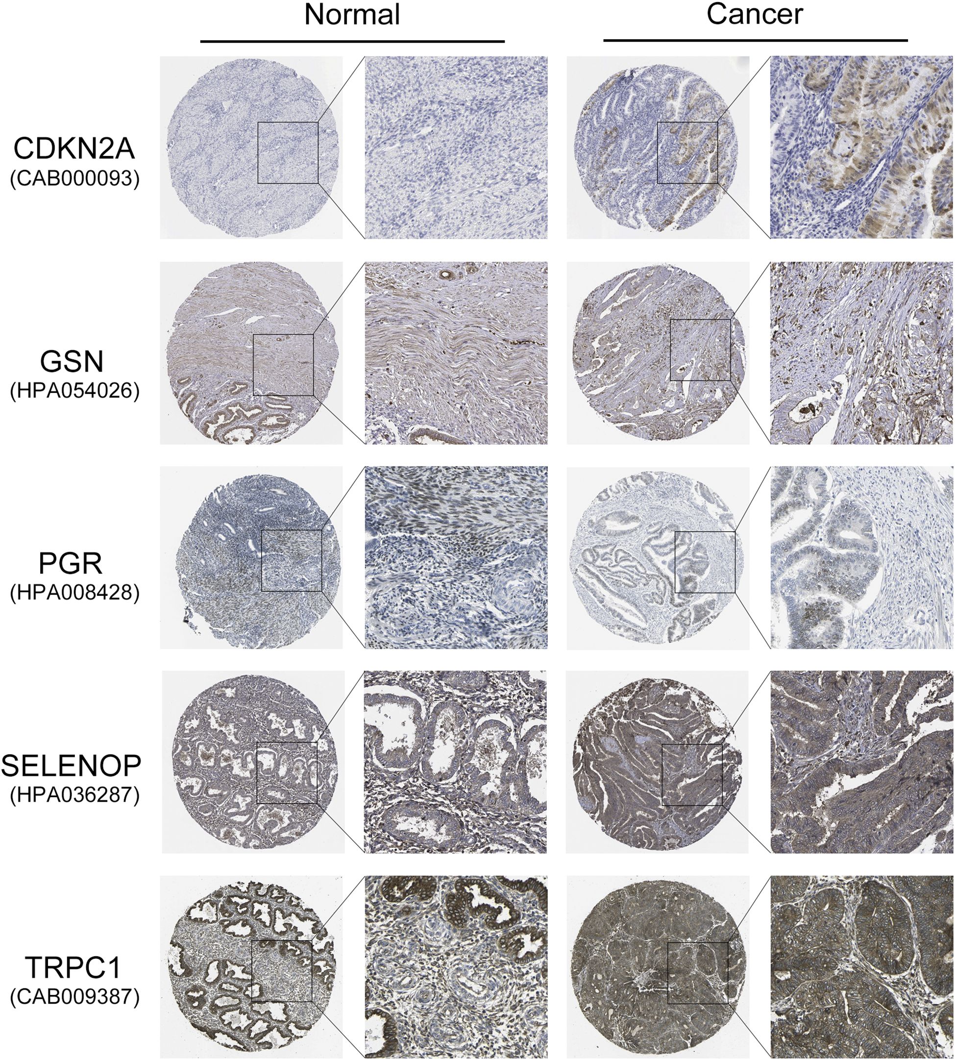 To further validate the expression patterns of the five key genes (CDKN2A, GSN, PGR, SELENOP, and TRPC1) identified in our prognostic model at the protein level, we utilized immunohistochemistry (IHC) staining data from the Human Protein Atlas (HPA) (https://www.proteinatlas.org/). The HPA database provides high-resolution IHC images for a wide range of human proteins in both normal and cancerous tissues. We specifically retrieved and analyzed the IHC staining results for these five proteins in normal endometrial tissue and UCEC samples.