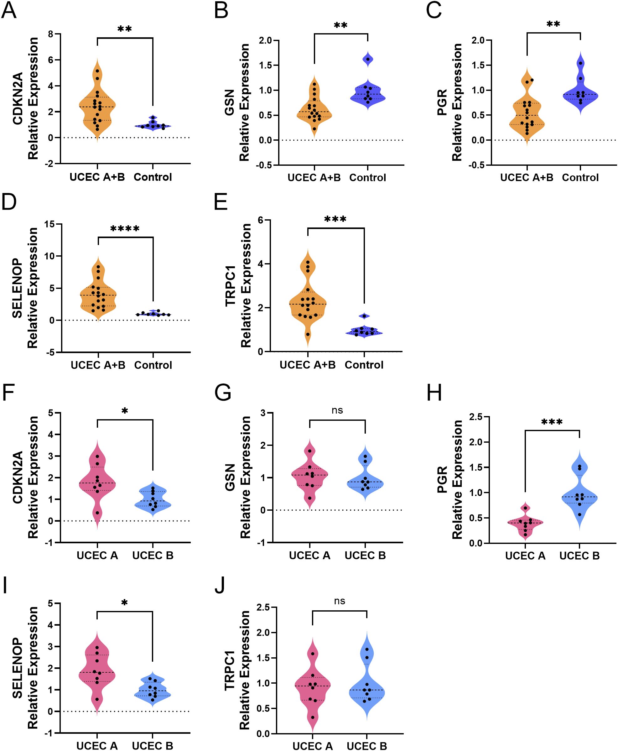 Figure 8. Differential expression of diabetes-related genes in UCEC tissues. (A–E) Comparison of gene expression between the combined UCEC group (UCEC A + UCEC B, n=16) and the Control group (normal endometrium, n=8): CDKN2A (A), GSN (B), PGR (C), SELENOP (D), TRPC1 (E). (F–J). Direct comparison of gene expression between UCEC patients with diabetes (UCEC A, n=8) and those without diabetes (UCEC B, n=8): CDKN2A (F), GSN (G), PGR (H), SELENOP (I), TRPC1 (J). Statistical significance: ns > 0.05; *P < 0.05; **P < 0.01; ***P < 0.001; ****P < 0.0001.