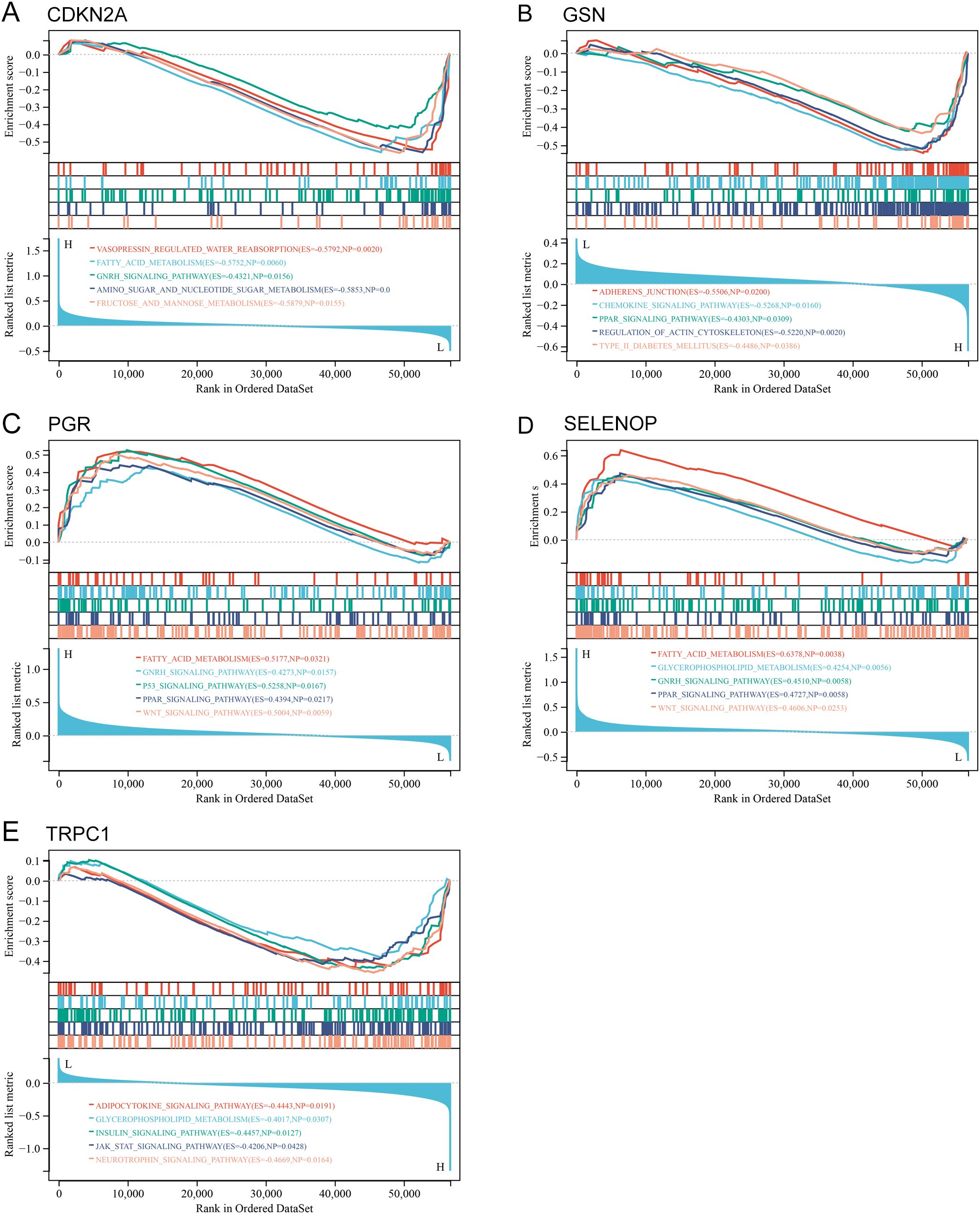 Figure 10. GSEA of hub genes in UCEC. (A-E) GSEA plots showing enriched pathways for each hub gene: (A) CDKN2A, (B) GSN, (C) PGR, (D) SELENOP, (E) TRPC1. P value of < 0.05 and FDR of < 0.25.