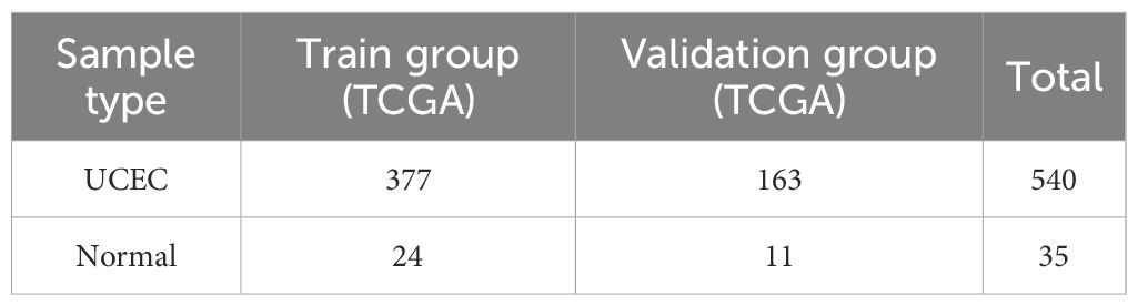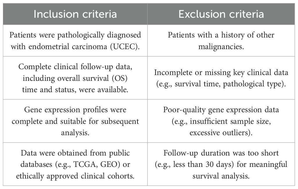 On August 20th, we acquired transcriptomic data along with relevant clinical and somatic mutation information for patients diagnosed with UCEC from TCGA (10) (https://cancergenome.nih.gov/). The dataset comprised records from 35 healthy individuals and 554 UCEC patients (11). Following the exclusion of individuals lacking complete clinical or follow-up information, we finalized a cohort of 540 patients for subsequent analysis. Detailed Inclusion and Exclusion Criteria are presented in Table 1. Furthermore, utilizing the GeneCards database (https://www.genecards.org/), we employed a filtering criterion encompassing protein-coding genes and diabetes-related annotations, yielding a total of 12,374 genes. To enhance the precision of our selection, we retained only the 3,111 genes with correlation coefficients exceeding the average value (Supplementary Table S1), which will be subjected to subsequent differential gene expression analysis. The gene expression data were normalized using the Robust Multi-array Average (RMA) method, as implemented in the limma R package (12).