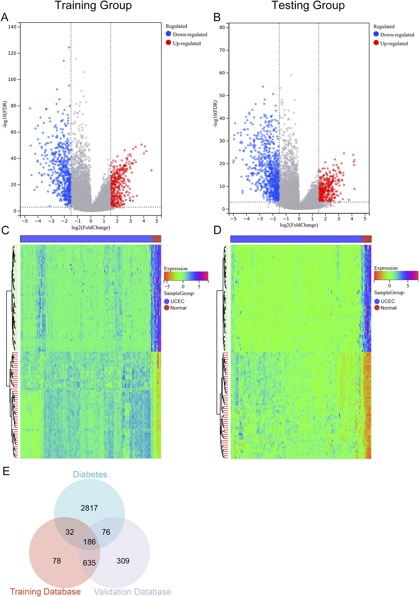 Volcano plot, heat map, and Venn diagram. (A, B) The volcano plots for the Training group and Testing group, with upregulated genes represented in red and downregulated genes in blue. (C, D) The heat maps for the Training group and Testing group. (E) Venn diagram illustrating overlapping genes from both groups and the diabetes database.