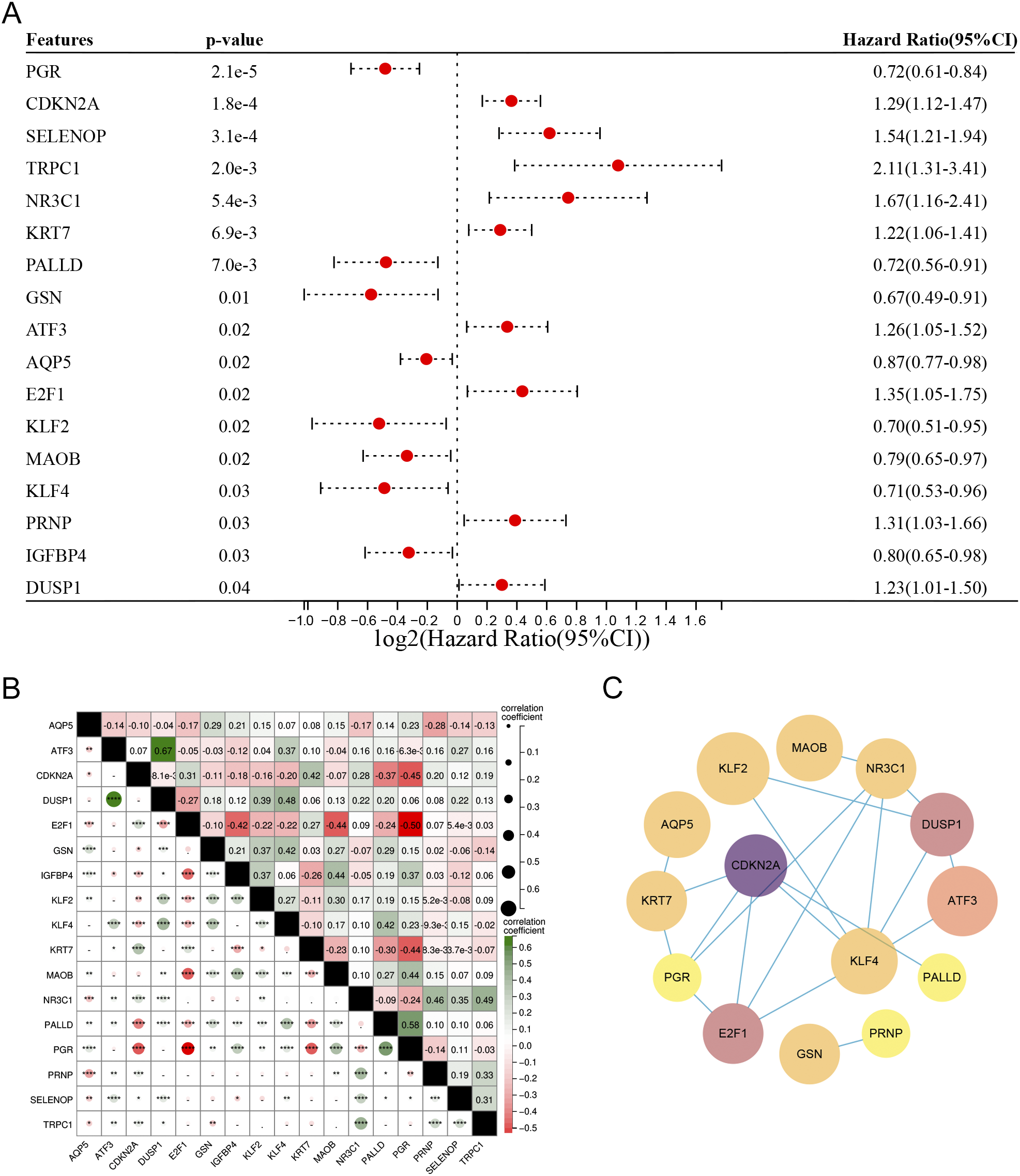 (A) Univariate Cox regression analysis of the 186 DM-DEGs, identifying 17 genes significantly associated with prognosis. (B) Correlation matrix for the 17 DM-DEGs. (C) PPI networks and key modules constructed via STRING and Cytoscape, featuring 20 edges and 17 nodes.