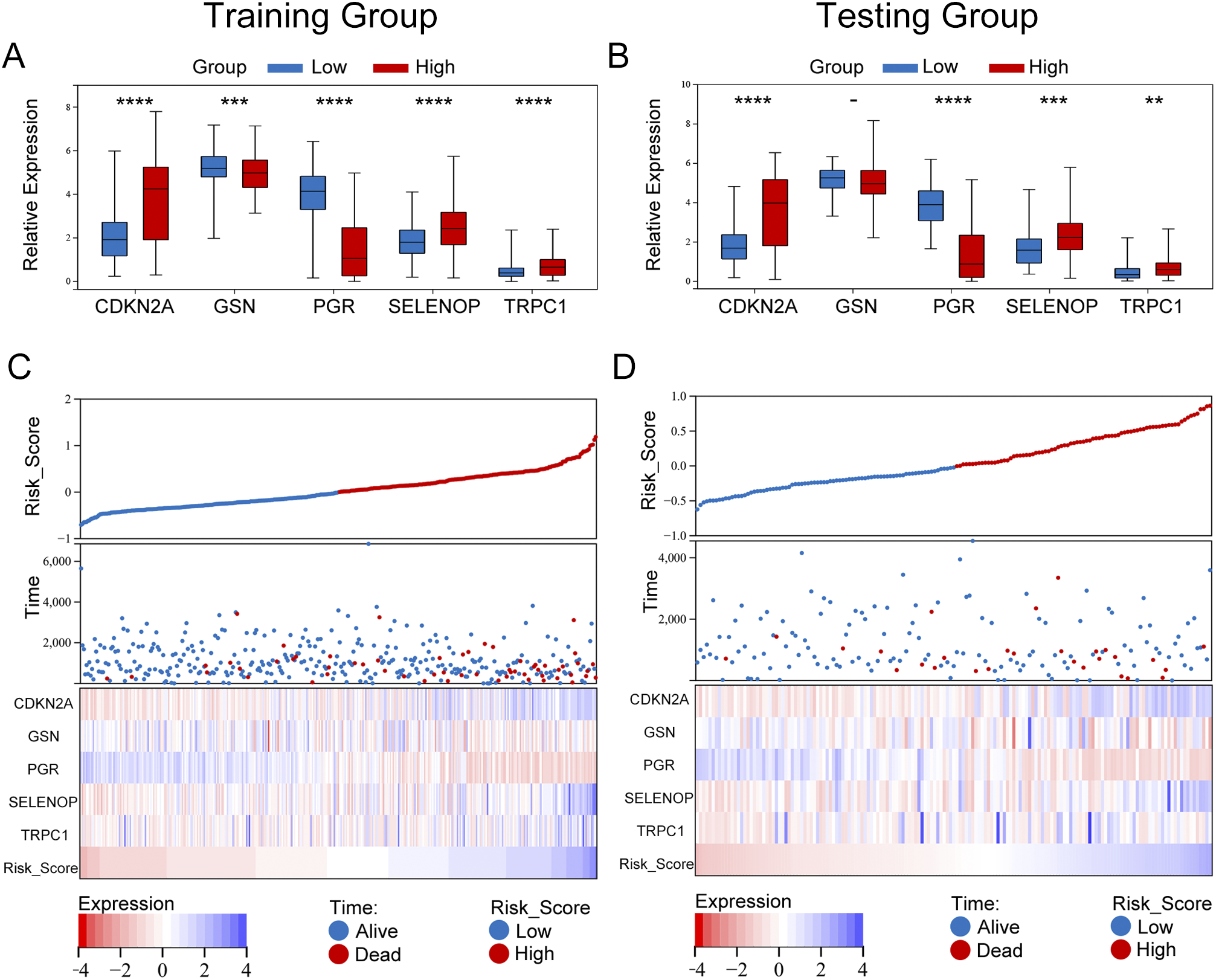 Expression differences and risk stratification of model genes in UCEC patients. (A, B) Box plots comparing the expression of five prognostic genes (TRPC1, SELENOP, CDKN2A, GSN, PGR) between high-risk and low-risk groups in the training (A) and validation (B) cohorts. Significance was determined by the Wilcoxon rank-sum test (****P < 0.0001, ***P < 0.001, **P < 0.01). Notably, GSN and PGR were significantly upregulated in the low-risk group, while CDKN2A, SELENOP, and TRPC1 were elevated in the high-risk group. (C, D) Integrated visualization of risk scores, survival outcomes, and gene expression heatmaps for the training (C) and validation (D) cohorts. Patients were stratified by the optimal risk score cut-off (0.1897), with high-risk patients (red) showing higher mortality rates. The heatmap confirmed consistent expression patterns across cohorts, with high-risk patients exhibiting elevated CDKN2A/SELENOP/TRPC1 and low-risk patients showing dominant GSN/PGR expression.