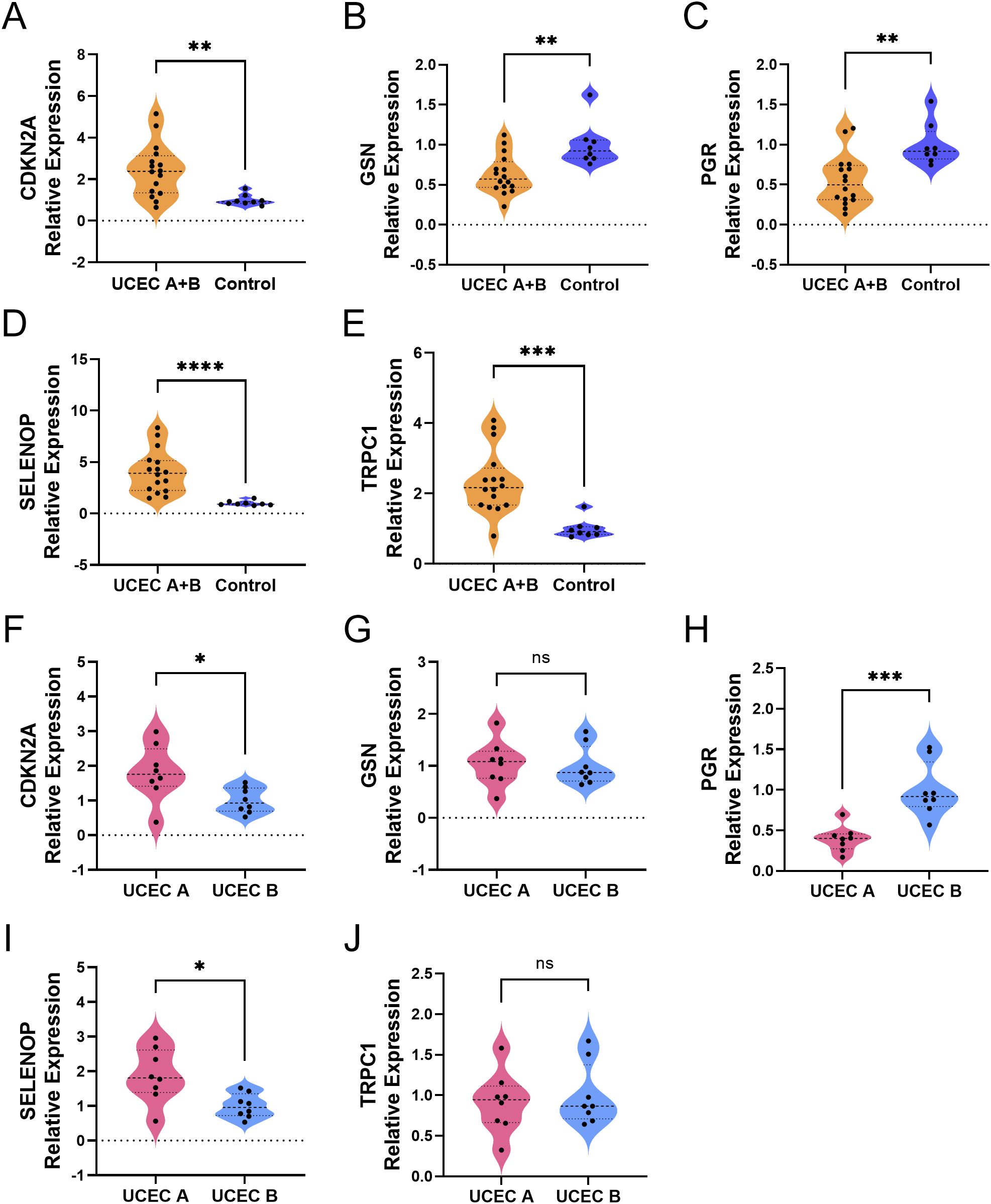 Differential expression of diabetes-related genes in UCEC tissues. (A–E) Comparison of gene expression between the combined UCEC group (UCEC A + UCEC B, n=16) and the Control group (normal endometrium, n=8): CDKN2A (A), GSN (B), PGR (C), SELENOP (D), TRPC1 (E). (F–J). Direct comparison of gene expression between UCEC patients with diabetes (UCEC A, n=8) and those without diabetes (UCEC B, n=8): CDKN2A (F), GSN (G), PGR (H), SELENOP (I), TRPC1 (J). Statistical significance: ns > 0.05; *P < 0.05; **P < 0.01; ***P < 0.001; ****P < 0.0001.
