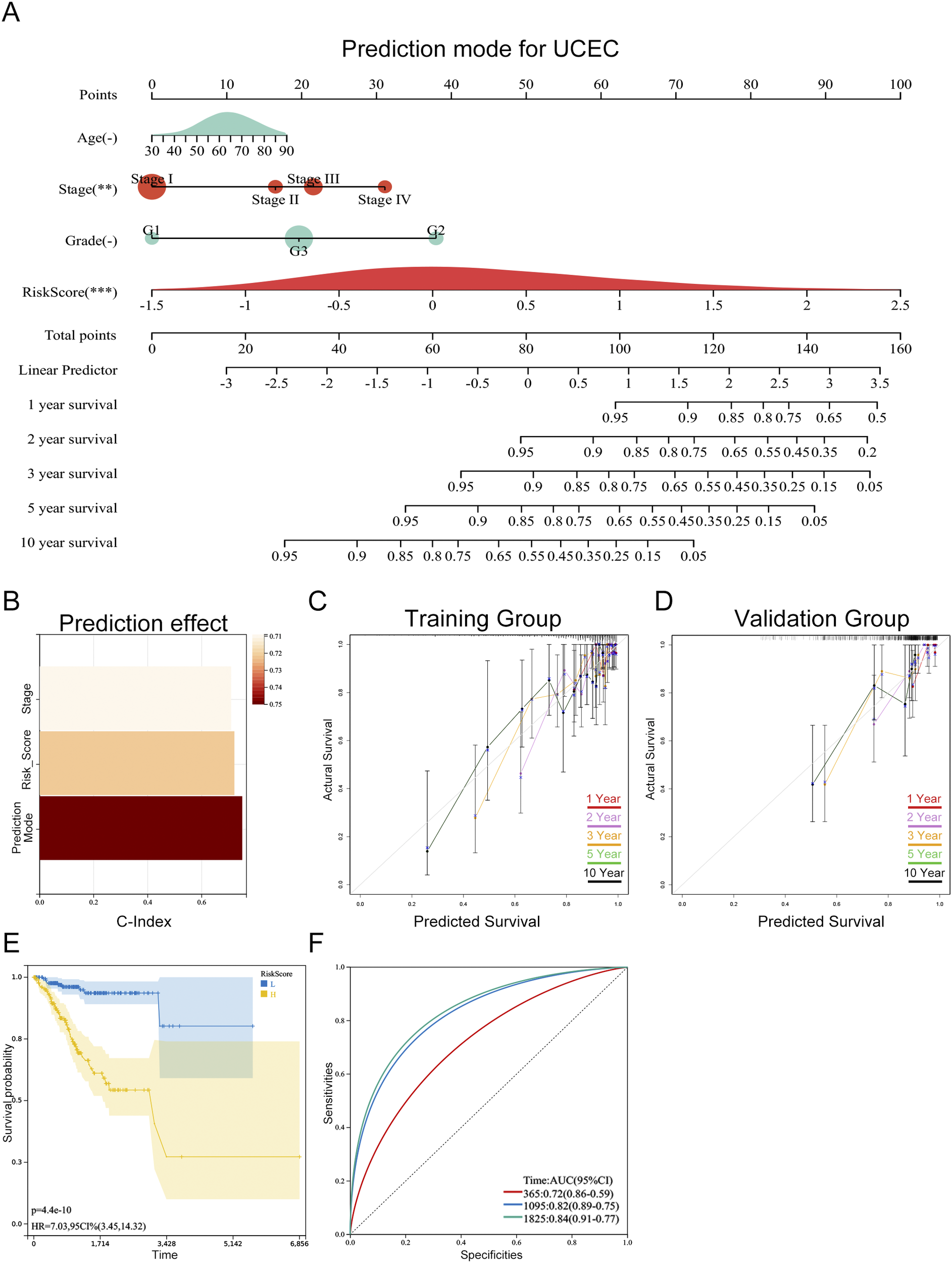 Personalized prognostic model for progression-free survival (PFS) in UCEC patients. (A) Nomogram predicting 1-, 2-, 3-, 5-, and 10-year PFS probabilities based on risk score and clinical parameters. The asterisks (-, **, ***) next to each variable denote its statistical significance in the multivariate Cox model (-P > 0.05, **P < 0.01, ***P < 0.001). (B) Model performance assessed by C-index (0.781, 95% CI: 0.72–0.84, P = 1.1e-19), indicating excellent discriminative ability. (C, D) Calibration curves for training (C) and validation (D) cohorts, showing alignment between predicted and observed PFS (Hosmer-Lemeshow test P > 0.05, no significant deviation). (E) Kaplan-Meier survival curves stratified by nomogram-predicted risk groups, with significant PFS difference between high-risk and low-risk patients (log-rank test P < 0.001). (F) Time-dependent ROC curves for 1-, 3-, and 5-year PFS prediction, with AUC values of 0.72, 0.82, and 0.84, respectively (all P < 0.001).