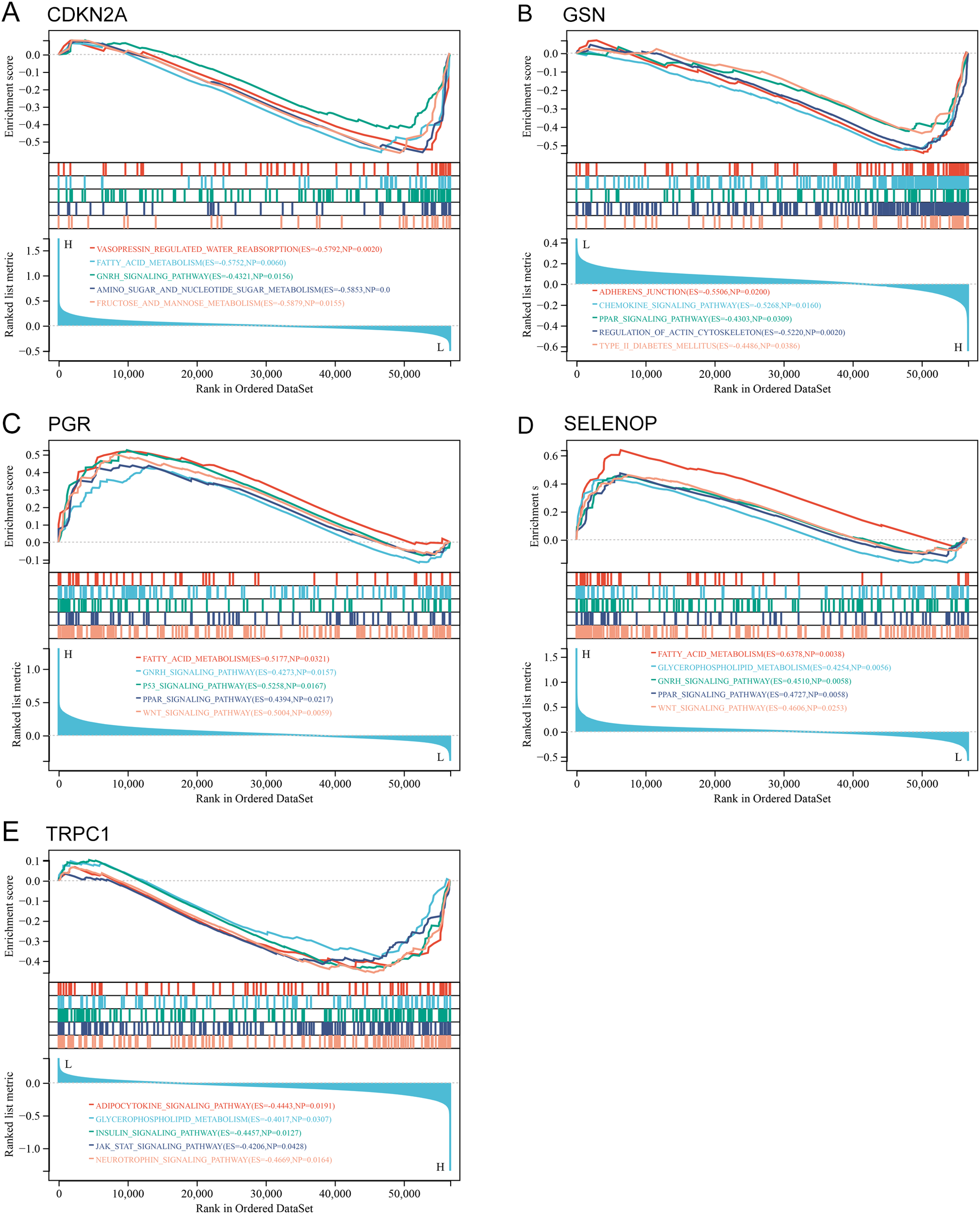 GSEA of hub genes in UCEC. (A-E) GSEA plots showing enriched pathways for each hub gene: (A) CDKN2A, (B) GSN, (C) PGR, (D) SELENOP, (E) TRPC1. P value of < 0.05 and FDR of < 0.25.