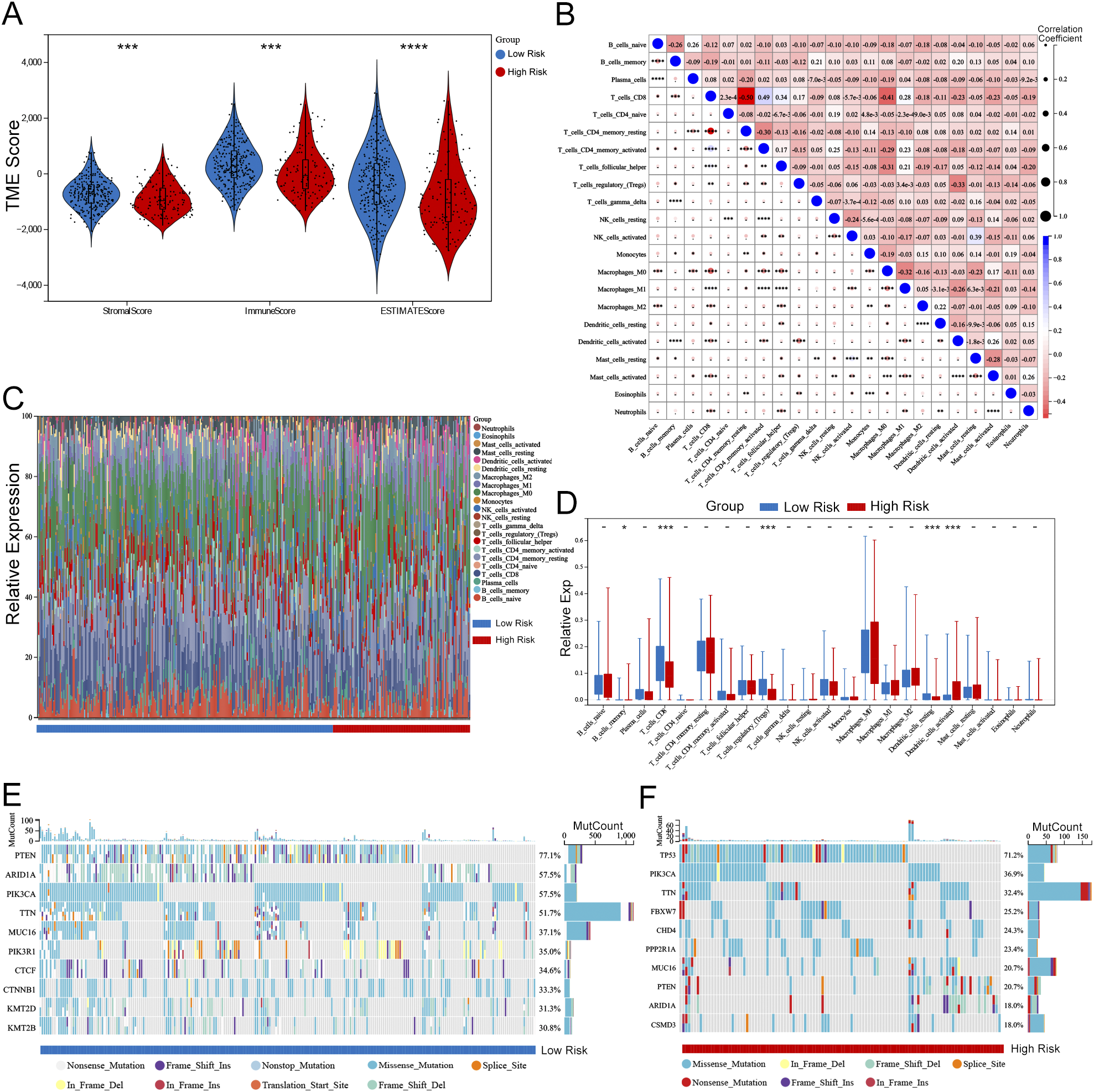 Association between risk score and TME in UCEC. (A) Violin plots comparing StromalScore, ImmuneScore, and ESTIMATEScore between high-risk and low-risk groups (Wilcoxon test, P < 0.001). (B) Correlation matrix of 22 immune cell populations (Pearson correlation, significant correlations marked with P < 0.05). (C) Stacked bar plots showing the distribution of immune cell types in high-risk vs. low-risk groups (e.g., CD8 T cells enriched in low-risk group, P = 0.002). (D) Box plots highlighting differential expression of key immune cells (e.g., M1 macrophages: P < 0.01; Tregs: P < 0.05). (E, F) Waterfall plots of somatic mutations in low-risk (E) and high-risk (F) groups. TP53 mutation frequency was higher in high-risk group (71.2% vs. 32.5%, Fisher’s exact test P < 0.001). Statistical significance: -P > 0.05, *P < 0.05, **P < 0.01, ***P < 0.001, ****P < 0.0001.
