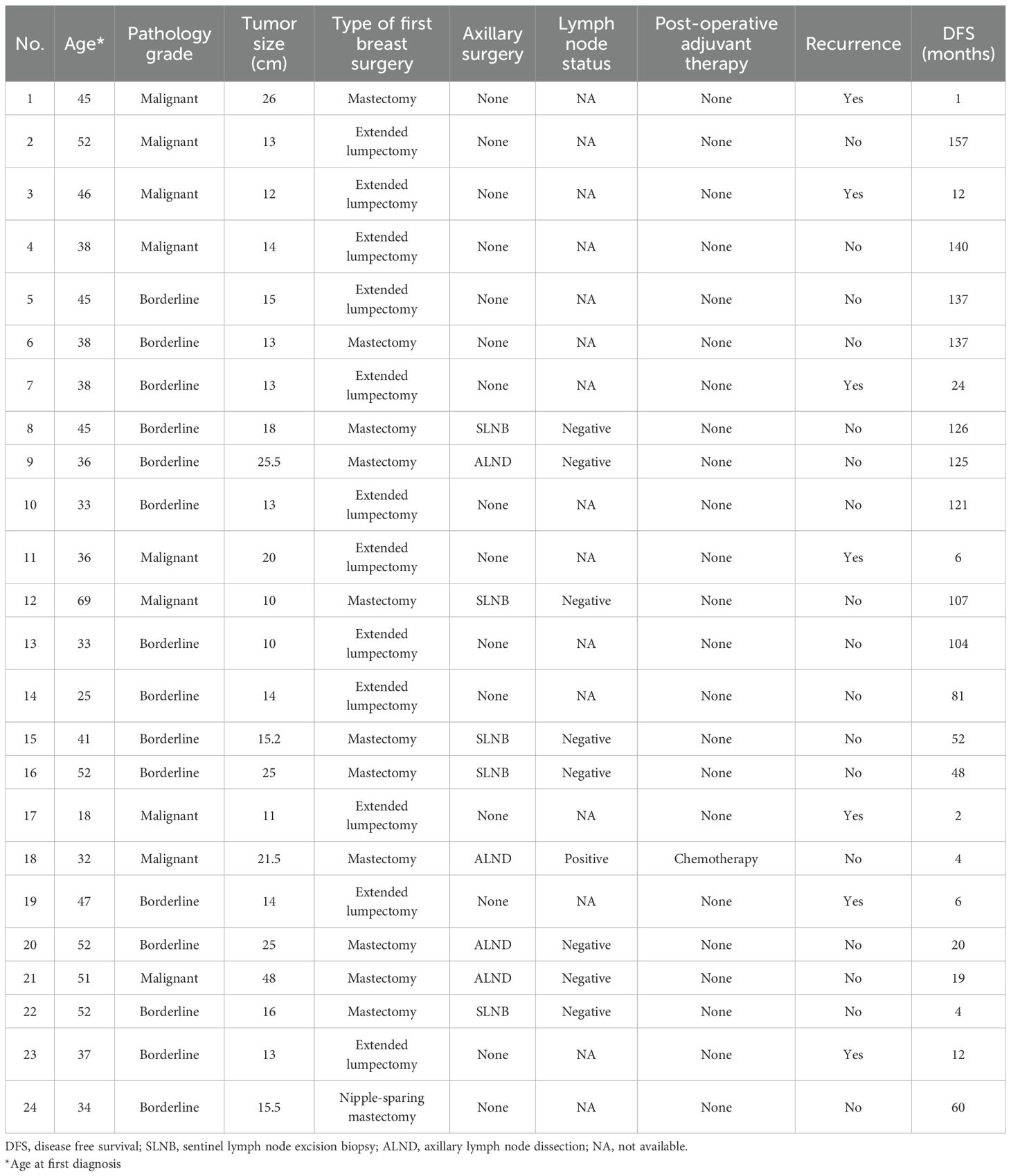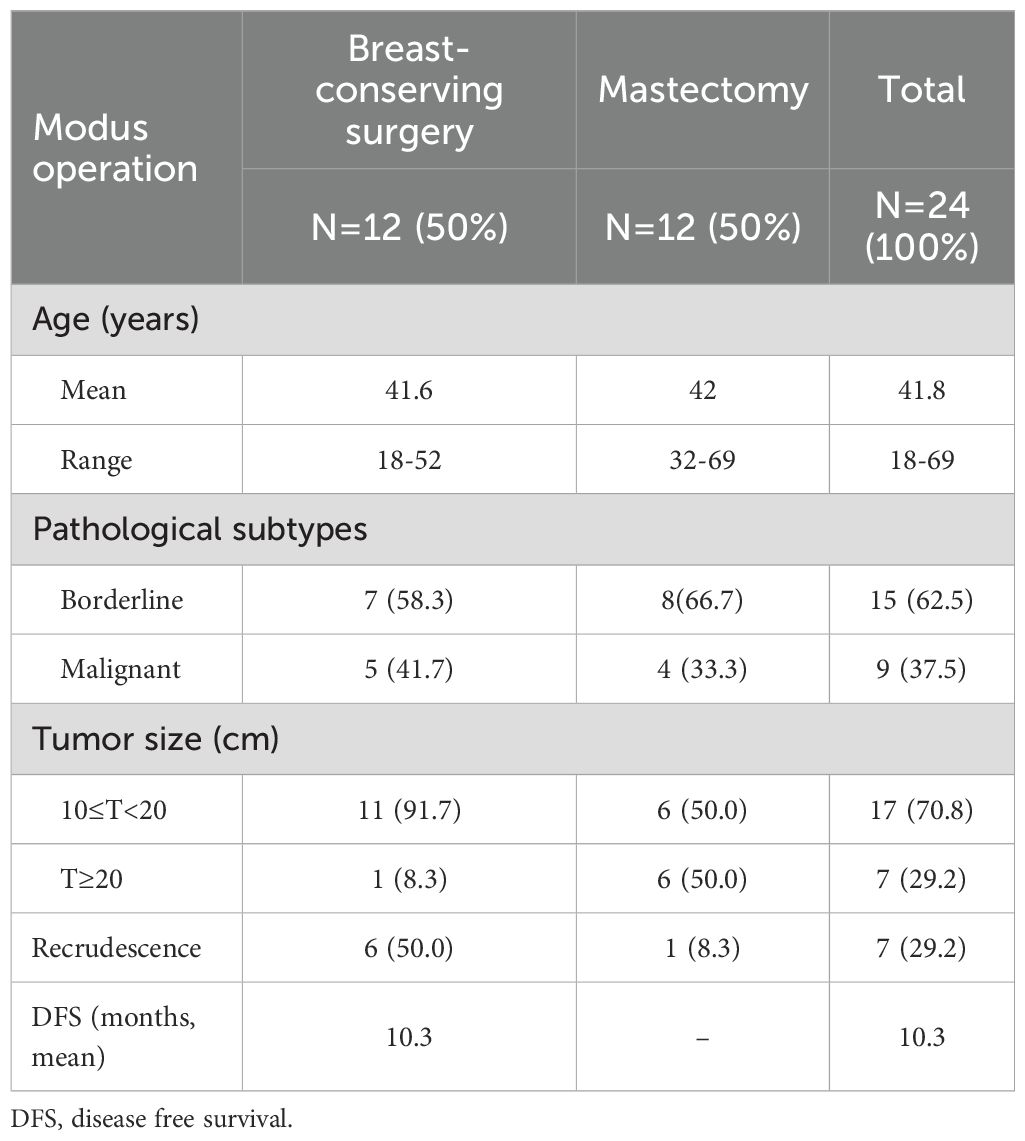 Results: This study included 24 patients with PTs >10 cm, including 15 borderline and nine malignant PTs. Among these patients, 12 underwent extended lumpectomy and 12 underwent mastectomy at initial diagnosis. All patients were followed up for a median of 49.8 months. Local recurrence occurred in 50% of the patients who underwent lumpectomy, whereas none of the patients who underwent mastectomy and achieved R0 resection had recurrence. Several special cases are described in detail separately.