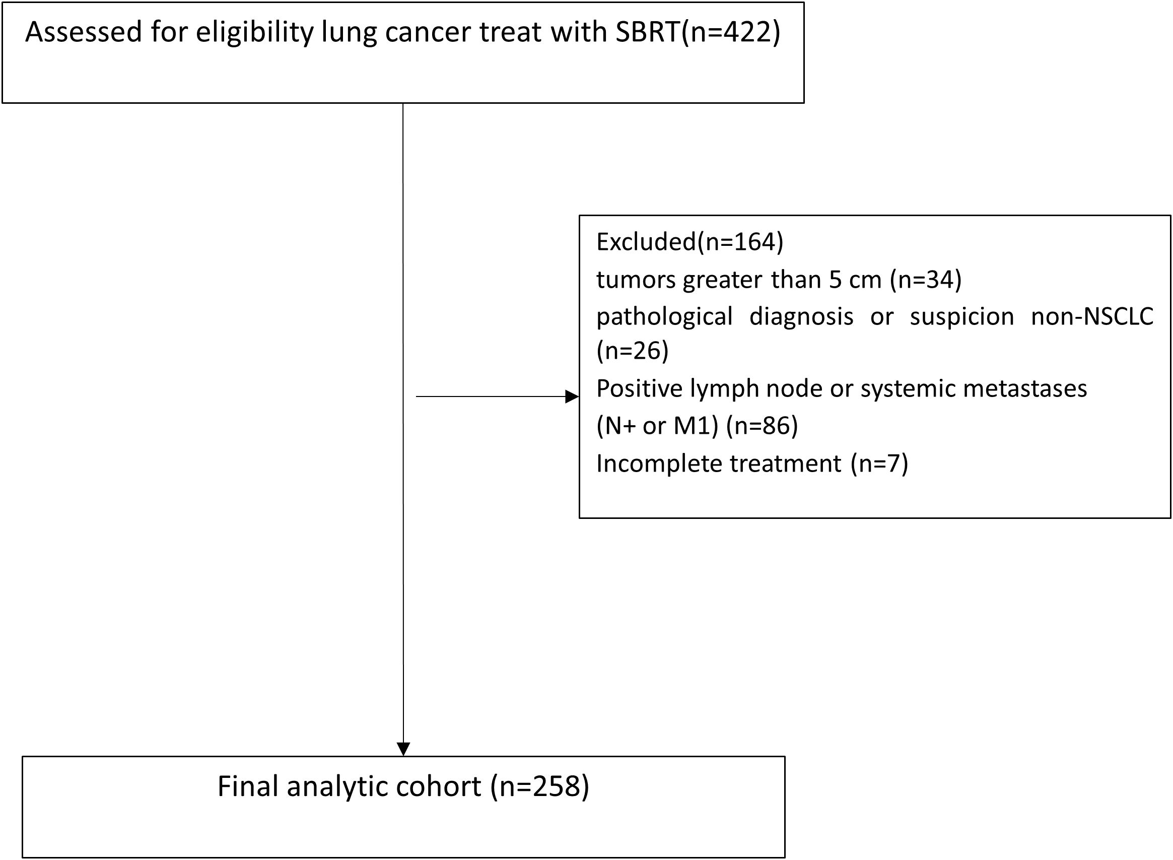 Clinical data were collected from patients with early-stage (T1-2N0M0) lung cancer who underwent SBRT at Shandong Cancer Hospital between June 2017 and July 2022. SBRT was defined as≥5 Gy per fraction using photons, in case of hypercentral lung cancer, 60Gy/15fractions, 4Gy per fraction was also permissible. Tumors were staged according to the 8th edition of the American Joint Committee on Cancer (AJCC) TNM staging system (7). All patients were discussed as either ineligible for surgery or refused surgery and were scheduled for SBRT by radiation oncologist. Inclusion criteria: 1. tumor diameter ≤5 cm (T1: ≤3 cm, T2: >3–5 cm); 2. no evidence of nodal or distant metastasis (staging via PET-CT and/or brain MRI if necessity); 3. medically inoperable or refusal of surgery. Exclusion criteria were as follows: 1. tumors greater than 5 cm in the greatest dimension; 2. patients with pathological diagnosis or suspicion of small cell lung cancer (SCLC) or large cell neuroendocrine carcinoma (LCNEC); 3. positive or suspected regional lymph node metastases, mediastinal spread, or systemic metastases inferred by CT, PET-CT, or endobronchial ultrasound (EBUS); 4. 1 month or less of follow-up; 5. patients with missing treatment information; and 6. treatment was not completed as planned. Patient flow diagram was shown in Figure 1.