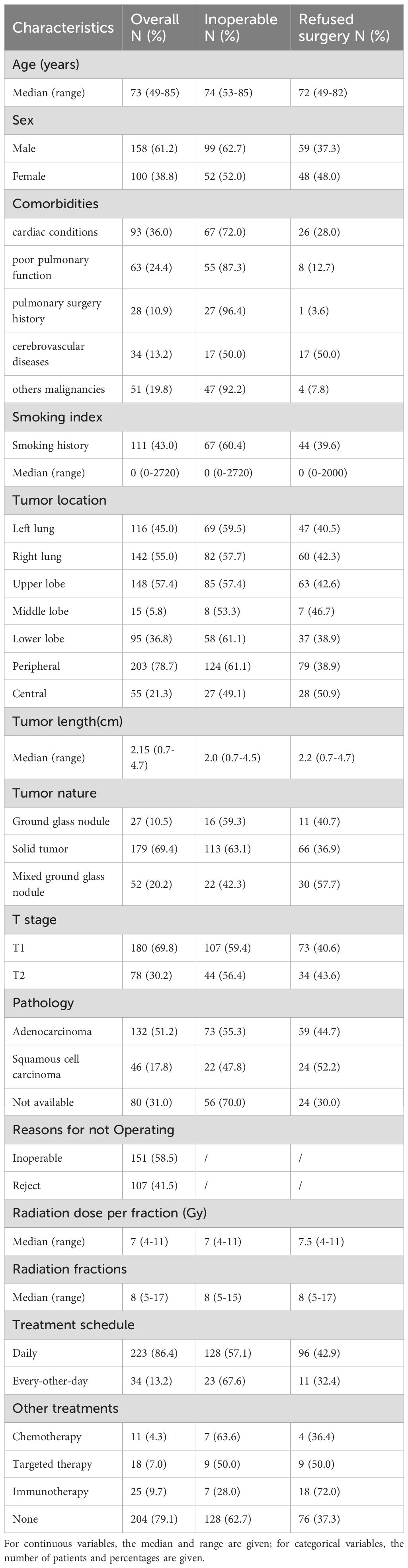 From 2017 to 2022, a total of 258 eligible patients were collected. The median age of these patients was 73 years (range: 49–85), with 41.5% aged ≥75 years and 21.3% aged ≥80 years, reflecting an overall elderly population. 58.5% patients were medically inoperable and 41.5% patients refusing surgery. Tumor size and location: T1 (69.8%), T2 (30.2%); peripheral (78.7%), central (21.3%). Among 258 patients, 178 (69.0%) had pathological confirmation (132 adenocarcinoma, 46 squamous cell carcinoma), while 80 (31.0%) were diagnosed based on multidisciplinary consensus integrating imaging and clinical criteria. 151(58.5%)patients could not tolerate surgery, and 107 (41.5%) patients refused surgery due to advanced age or surgical risks. Demographic and clinical characteristics are shown in Table 1.