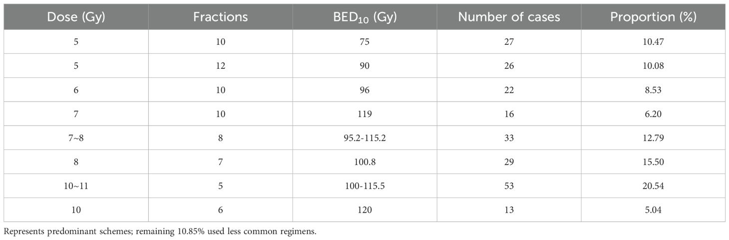 The single dose of radiotherapy was 4-11Gy, the median value was 7Gy, the fractions of radiotherapy range from 5 to 15, the BED10 range from 75Gy to 144Gy, the median BED10 value was 100Gy, and 56.2% of the BED10 was greater than or equal to 100Gy. The Common Dose Fractionation Schemes are shown in Table 2. Radiation oncologists individualize radiation doses and fractionation schedules based on factors such as lesion size, number, proximity to the chest wall and main bronchi, respiratory motion characteristics, and tumor location. Additionally, they determine whether to deliver treatment daily or every-other-day to optimize therapeutic efficacy while minimizing toxicity. All treatments utilized cone-beam CT (CBCT) for daily image guidance, with respiratory motion managed by 4D-CT simulation in 98% of cases.
