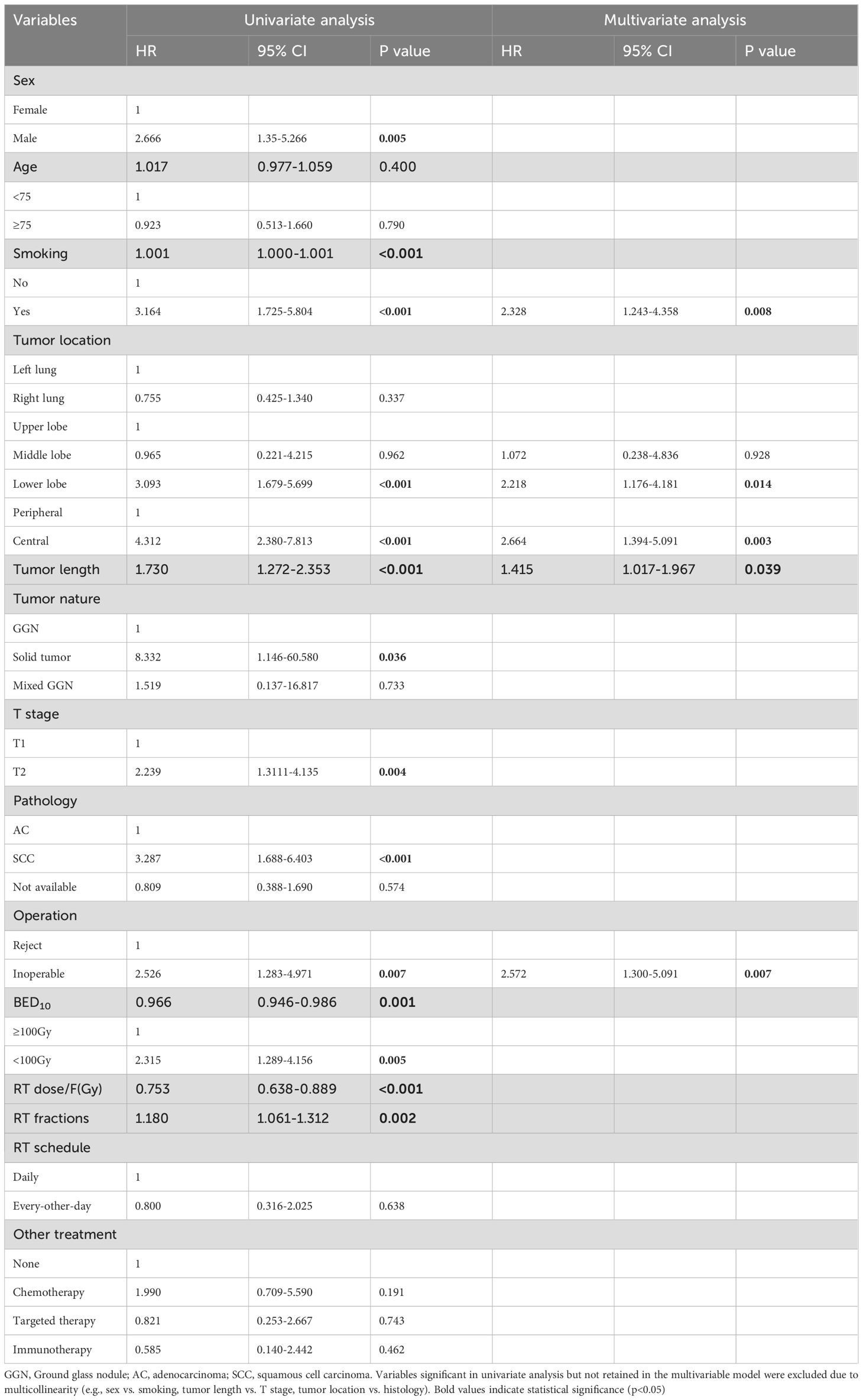 Continuous variables are presented as median and range. Categorical variables are presented as frequencies and percentages. Differences in treatment outcomes, including LC, PFS and OS, were calculated using Kaplan-Meier survival curves with log-rank tests. Univariable/multivariable Cox regression analysis for OS. Multivariable Cox proportional hazards regression used forward likelihood ratio (LR) selection (entry p <0.05) for variables significant on univariable analysis. Variables with p<0.05 in univariate analysis were entered. Some significant variables (e.g., sex, T stage, histology, and radiation fractions) were excluded stepwise due to multicollinearity, as male sex strongly overlapped with smoking status, tumor length correlated with T stage, and adenocarcinoma predominated in peripheral tumors. Competing risks (Fine-Gray) were used for CSS (cancer vs. non-cancer death). Deaths from causes unrelated to lung cancer were treated as competing events. Statistical analyses were performed with SPSS statistical software, version 29.0 and R statistical software, version 4.4.2. A p value less than 0.05 was considered statistically significant.