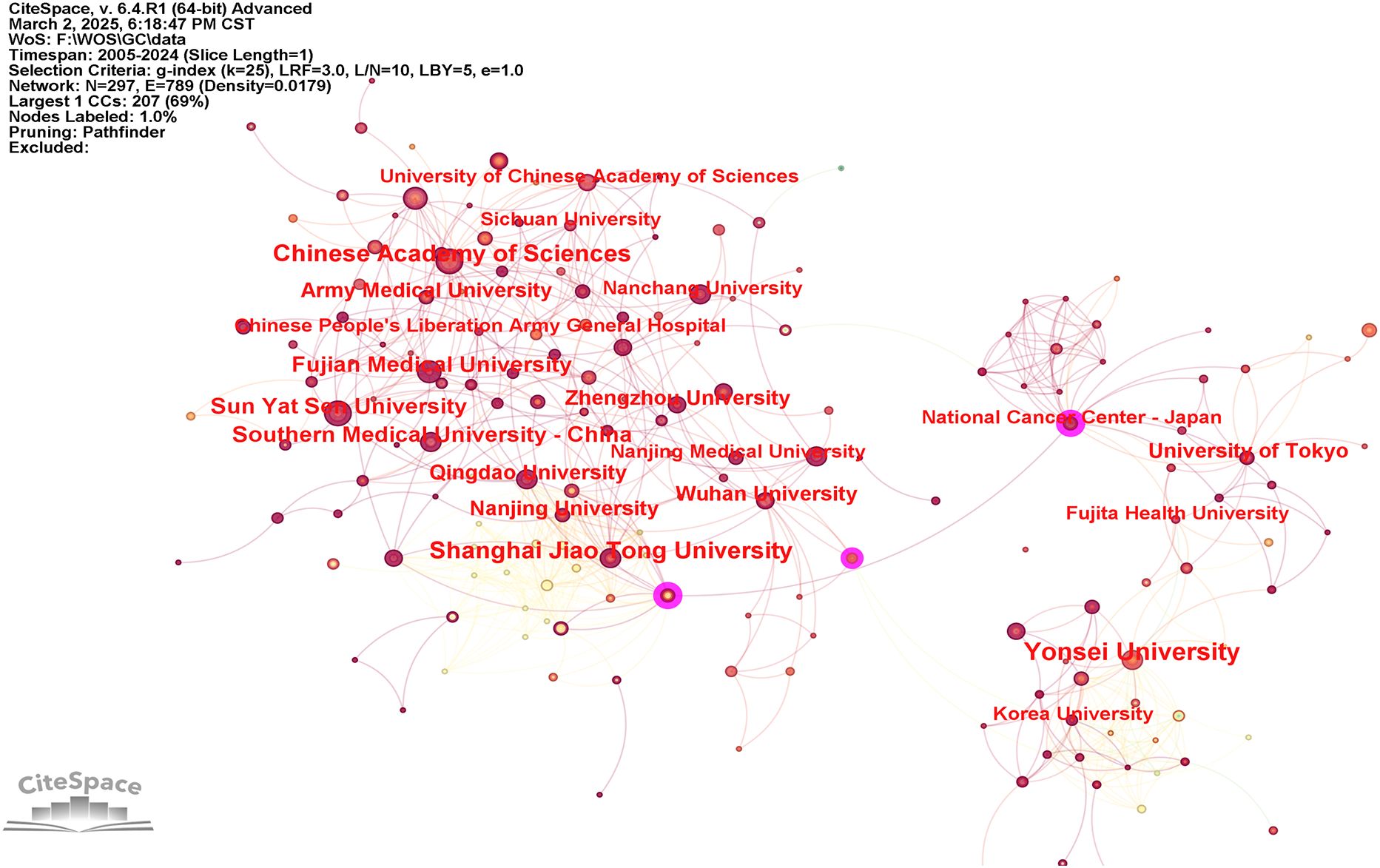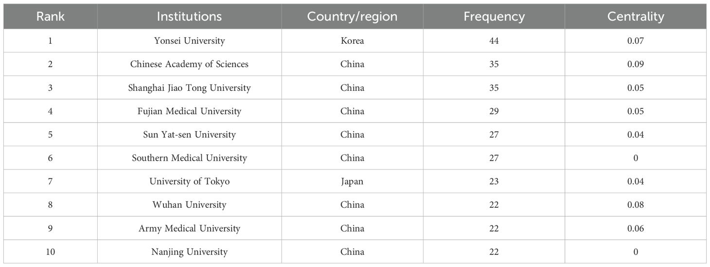 To examine institutional contributions to the application of AI in GC, an analysis was conducted of publication counts by institution. In total, 1,278 research institutions across the globe were recognized as active contributors within this domain. The collaborative relationships among these institutions are visualized in Figure 4, whereas Table 2 provides the ranking of the ten institutions with the most substantial publication output. As illustrated, Yonsei University, the Chinese Academy of Sciences, and Shanghai Jiao Tong University accounted for the highest numbers of publications, with 44, 35, and 35, respectively. Furthermore, the National Cancer Center – Japan, Azienda Ospedaliero Universitaria Careggi, Huazhong University of Science and Technology, Tianjin Medical University, and Fudan University were distinguished by centrality values equal to or exceeding 0.1.