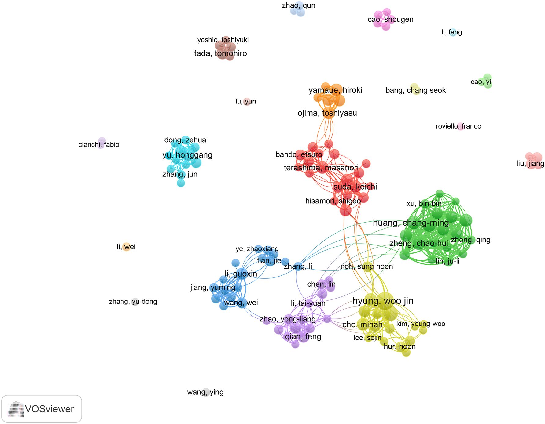 In this context, nmax denotes the publication count of the most prolific contributor. Accordingly, individuals with 5 or more published works were designated as core authors, leading to the identification of 135 such contributors. As shown in Table 5, Woo Jin Hyung is the most prolific author with 35 publications and an H-index of 71. Following him are Hyoung-Il Kim (21 publications, H-index = 54) and ChangMing Huang (18 publications, H-index = 39). Figure 6 presents the co-authorship network of researchers with at least 5 publications, illustrating the patterns of collaboration among leading contributors in the field. The magnitude of each node reflects the volume of publications it represents, whereas the coloration of nodes and their connecting links denotes the clustering to which they belong. Notably, the 135 core authors with 5 or more publications form 7 larger clusters.
