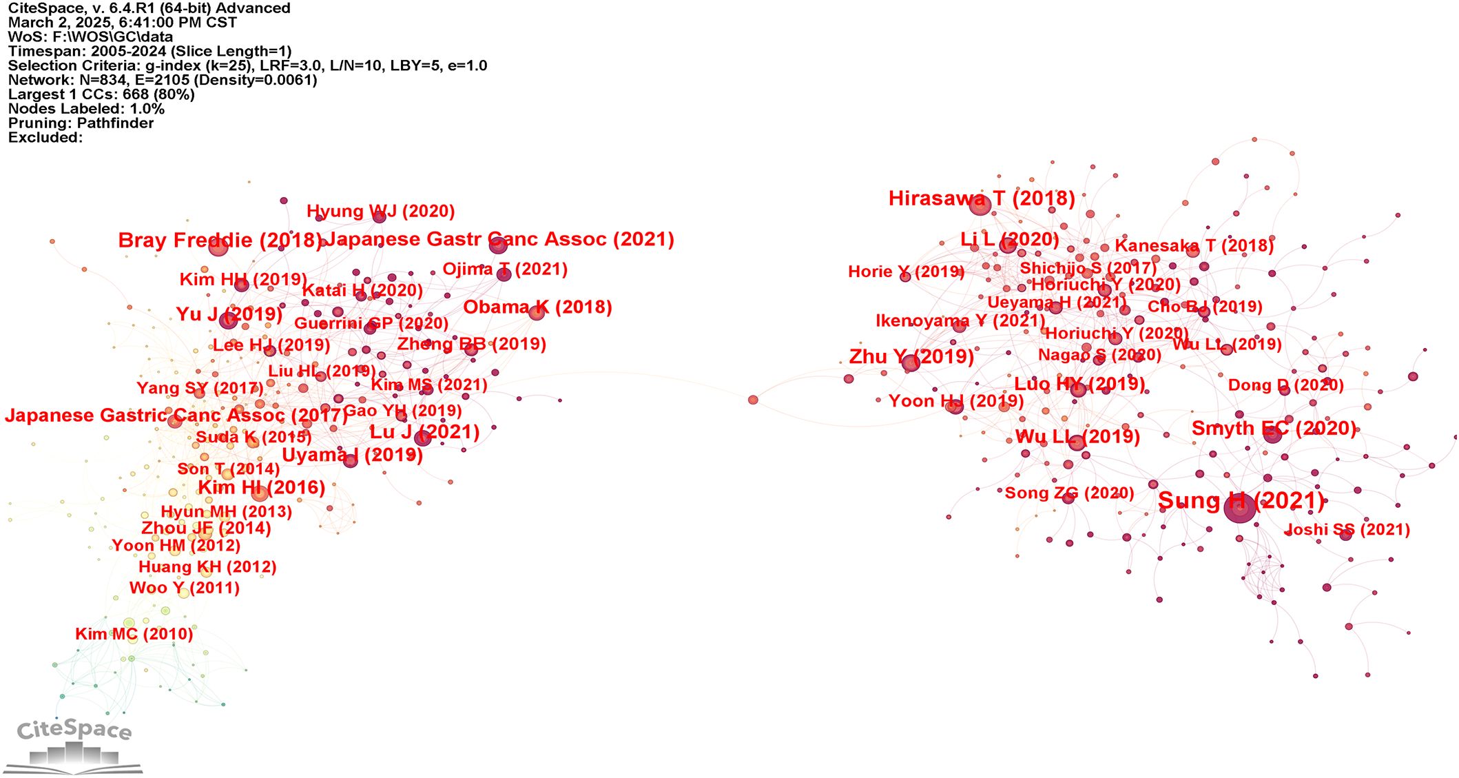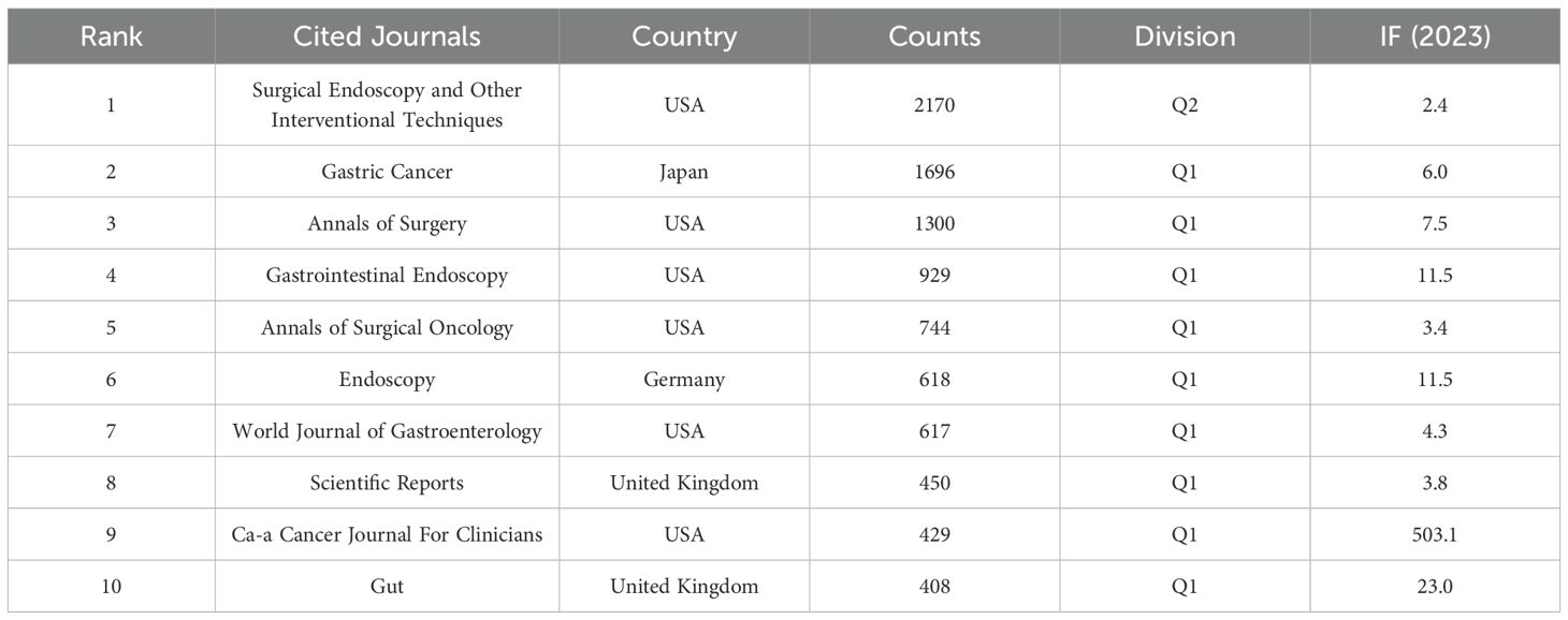 Figure 5 illustrates the visualization network of cited journals with at least twenty citations. As shown in Table 4, Surgical Endoscopy and Other Interventional Techniques (2170) was identified as the most frequently cited journal. It was followed by Gastric Cancer (1696) and Annals of Surgery (1300). The cited journals were classified in Q2, except for Surgical Endoscopy and Other Interventional Techniques, whereas the remaining nine journals were classified in Q1. Notably, CA: A Cancer Journal for Clinicians and Gut exhibited high levels of activity in this field, with impact factors of 503.1 and 23, respectively.