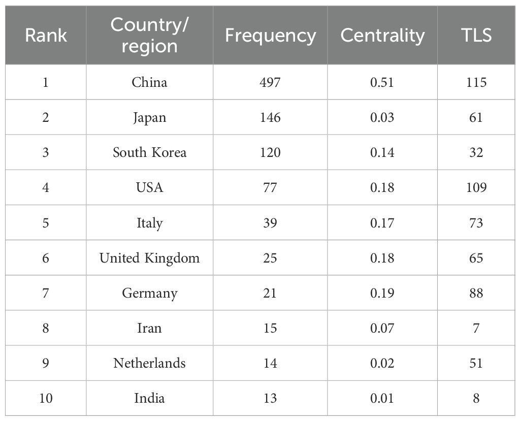 A total of 51 countries or regions were found to have engaged in research within this domain. Figure 3 presents the geographic distribution of contributing countries or regions, while Figure 3 depicts the network of international cooperation. As shown in Table 1, China was ranked first with 497 publications, followed by Japan (146), Korea (120), and the United States (77). The remaining countries or regions each contributed fewer than 40 publications. Notably, China and the United States exhibited the highest TLS, suggesting stronger collaborative relationships with other countries.