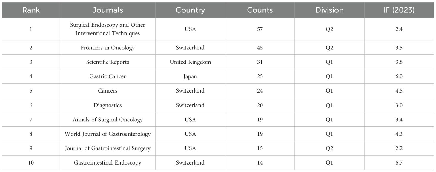 Academic journals are crucial for scholarly publications, and evaluating the number of publications in journals can assist researchers in selecting appropriate venues for manuscript submission. Surgical Endoscopy and Other Interventional Techniques published the highest number of papers, totaling 57. It is noteworthy that the top 10 academic journals, based on the number of publications, are primarily classified as Q1 and Q2, with 70% of journals in Q1 and 30% in Q2. The journal with the highest impact factor was Gastrointestinal Endoscopy (6.7), followed by Gastric Cancer (6.0). However, despite the significant contributions of Asian countries to research on AI applied to GC, only one Asian journal appears in the top 10, indicating underrepresentation. Therefore, the establishment of influential global journals within the Asian region is crucial to advancing the field.