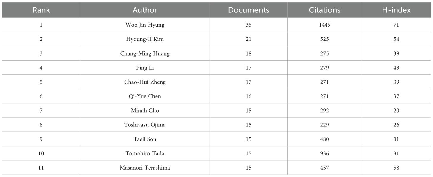 A total of 5,095 authors were involved in research related to this field. According to Price’s Law (22), the threshold for identifying core authors is established through the following formula, which specifies the minimum number of required publications:
