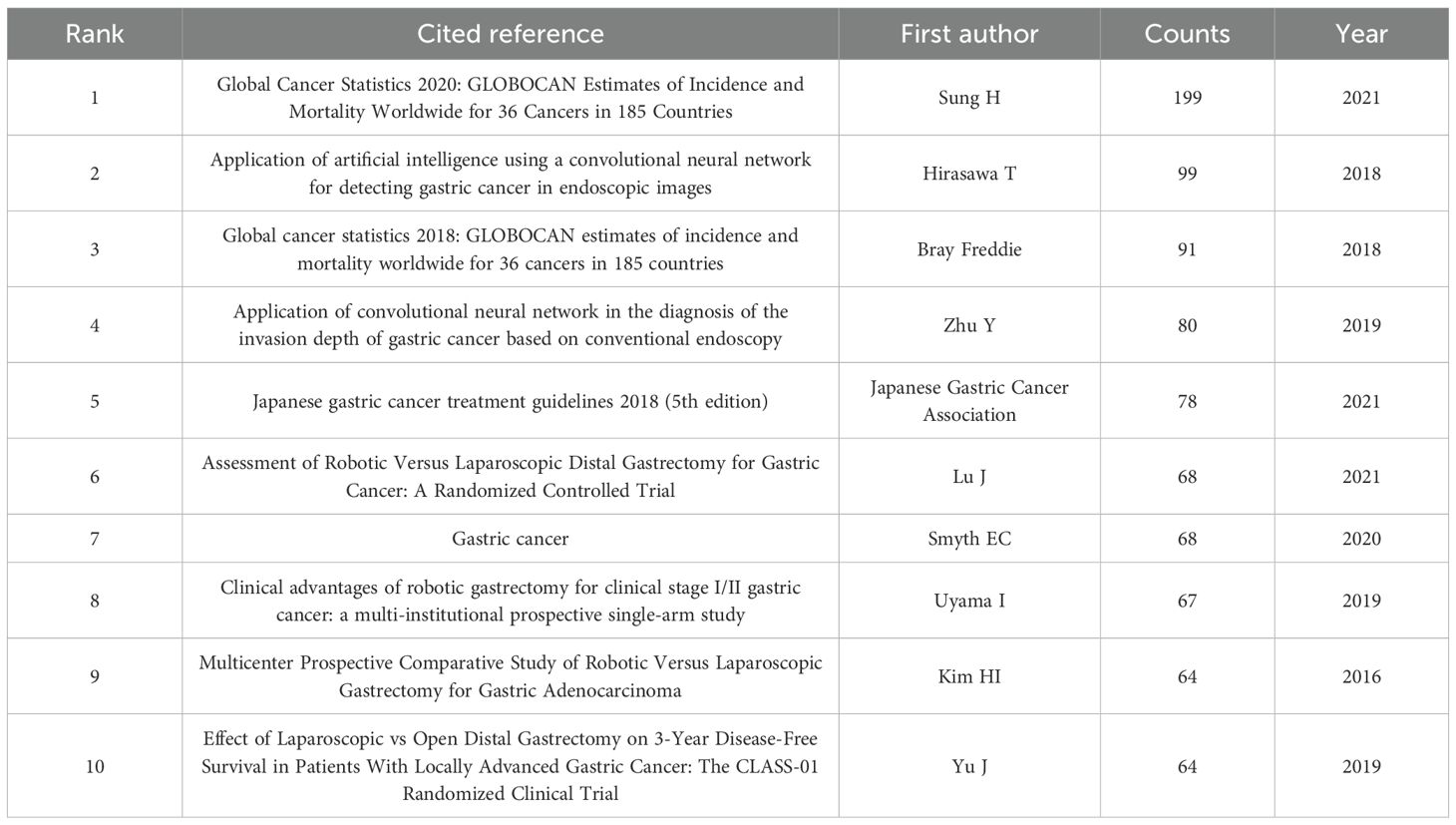 The analysis of co-cited references provides an essential basis for advancing disciplinary research, as it enables a more precise delineation of the central themes within the field. Using VOSviewer, a co-citation network of cited references was generated (Figure 7), while Table 6 displays the ten most frequently co-cited works, each referenced on more than sixty occasions. Notably, two articles provided comprehensive assessments of global cancer incidence and mortality in 2018 and 2020, respectively. The findings indicated that cancer continues to pose a major global public health challenge, and effective measures for prevention, detection, and treatment are considered essential for effective cancer control (1, 23). In addition, two other articles demonstrated the accuracy and specificity of AI in diagnosing GC and assessing the depth of tumor invasion (24, 25). In summary, these studies primarily addressed the epidemiology, diagnosis, and prognosis of GC.