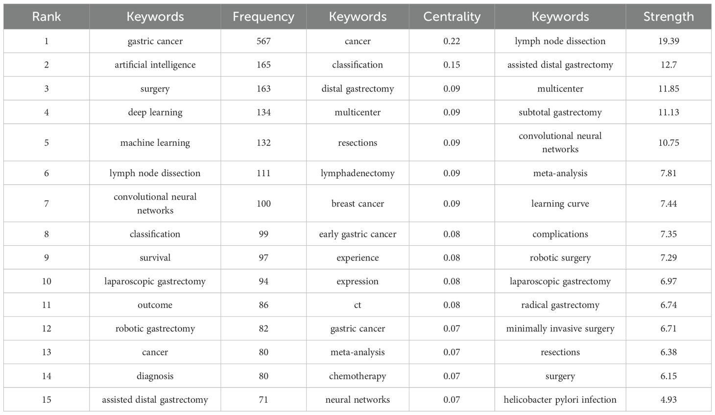 CiteSpace was utilized to construct the keyword co-occurrence network (Figure 8). In the resulting graph, each node is indicative of a keyword. The size of a node corresponds to the frequency with which the associated keyword appears. Larger nodes signify higher frequencies of occurrence, whereas smaller nodes indicate lower frequencies. As shown in Table 7, the most common keywords include gastric cancer (567), artificial intelligence (165), surgery (163), deep learning (134), machine learning (132), lymph-node dissection (111), convolutional neural networks (100), classification (99), survival (97), laparoscopic gastrectomy (94), and outcomes (86). And the keywords with high centrality include cancer (0.22) and classification (0.15).