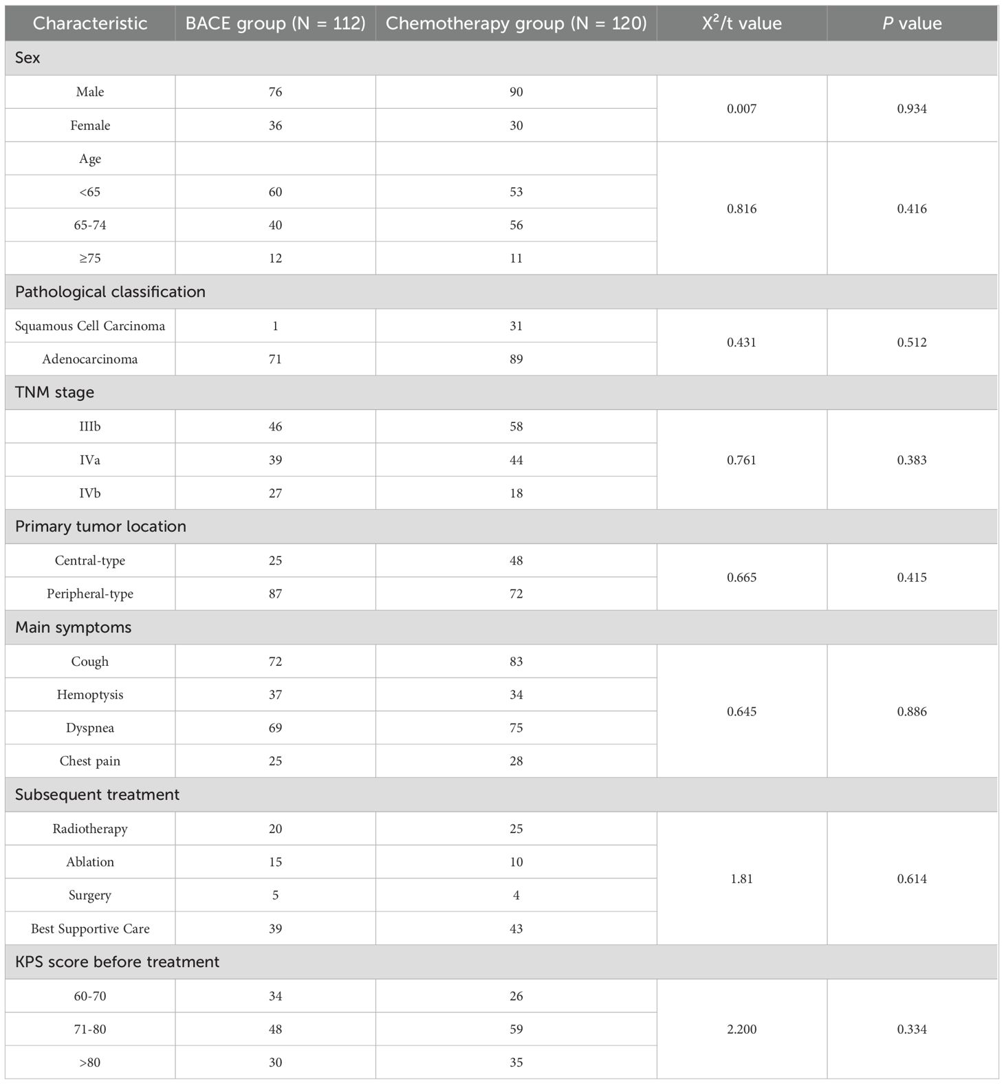 A total of 232 patients with inoperable non-small cell lung cancer (NSCLC) were included in the study, with 112 patients in the BACE group and 120 patients in the chemotherapy group. No statistically significant differences were observed between the two groups regarding basic clinical characteristics, including gender, age, pathological classification, TNM staging, distant metastasis, primary tumor site, main symptoms before treatment, and subsequent treatments (Table 1). The median follow-up time was 11 months (follow-up data was collected until September 30, 2024). At the end of the follow-up period, 157 patients had died, with 77 deaths in the BACE group and 80 deaths in the chemotherapy group. In addition, 9 deaths were recorded due to non-cancer-related causes (such as cardiovascular accidents, other accidents, etc.), with 4 from the BACE group and 5 from the chemotherapy group. According to the exclusion criteria, patients who died from non-cancer-related causes were excluded from the final data analysis. A total of 112 patients were included in the BACE group, with a loss-to-follow-up rate of 8.04%, while 120 patients were included in the chemotherapy group, with a loss-to-follow-up rate of 10.83%.