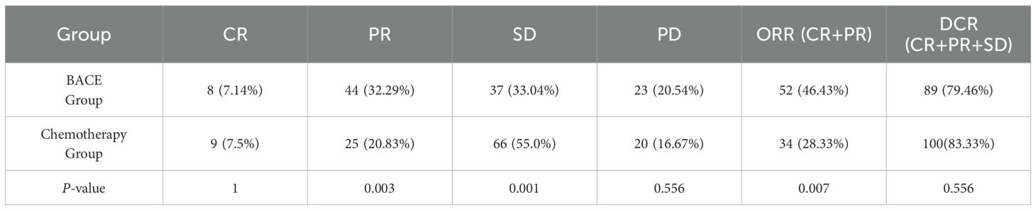 The results indicated that the BACE group demonstrated statistically significant differences compared to the chemotherapy group in terms of partial response (PR), stable disease (SD), and objective response rate (ORR), with P-values of 0.003, 0.001, and 0.007, respectively. The BACE group showed significantly better outcomes, suggesting that BACE may be more effective in reducing tumor burden in the short term. No significant differences were observed between the two groups regarding complete response (CR), progressive disease (PD), and disease control rate (DCR) (Table 2).