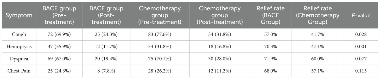 The results indicate that the BACE group exhibited statistically significant differences in the relief rates for cough and hemoptysis compared to the chemotherapy group, with P-values of 0.028 and 0.001, respectively. The BACE group showed significantly better outcomes. The relief rate for dyspnea showed a smaller difference between the two groups, with the BACE group achieving 71.9% and the chemotherapy group 60.0% (P = 0.077), demonstrating better efficacy in the BACE group. Similarly, the difference in the relief rate for chest pain between the two groups was modest, with the BACE group at 68.0% and the chemotherapy group at 57.1% (P = 0.115) (Table 3).