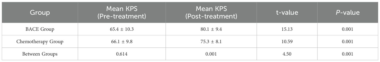 As shown in Table 4, the average KPS score for the BACE group before treatment was 65.4, and it improved to 80.1 after treatment, with a mean change of +14.7. In the chemotherapy group, the average KPS score before treatment was 66.1, which increased to 75.3 after treatment, with a mean change of +9.2. Between-group comparison revealed a statistically significant difference (P = 0.001), with the BACE group demonstrating a significantly greater improvement in KPS scores compared to the chemotherapy group.