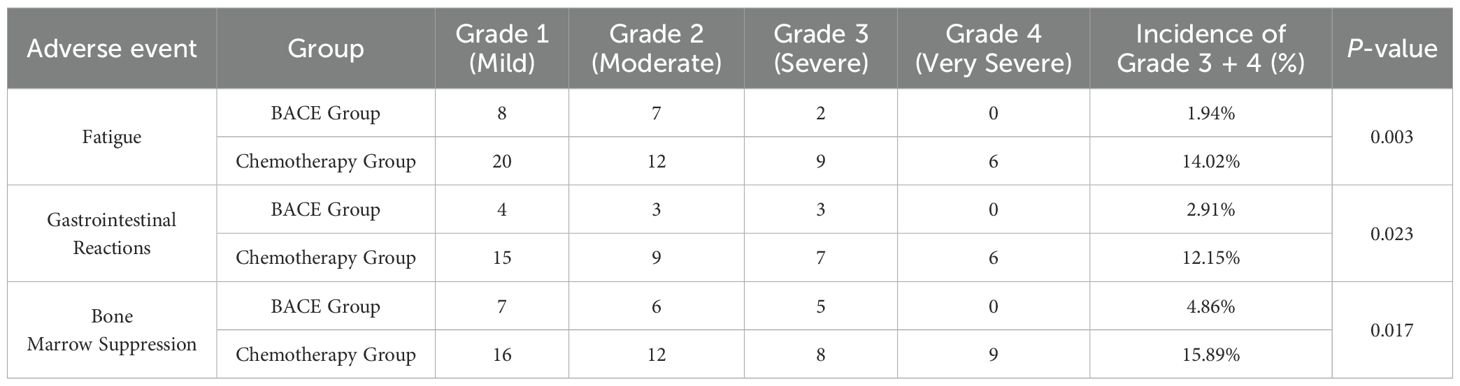 There was a significant difference in adverse events between the BACE and Chemotherapy groups. The incidence of grade 3–4 adverse events, including fatigue, nausea/vomiting, and myelosuppression, was significantly lower in the BACE group compared to the chemotherapy group, with rates of 1.94%, 2.91%, and 4.86%, respectively, compared to 14.02%, 12.15%, and 15.89% in the chemotherapy group. These differences were statistically significant (P-values of 0.003, 0.023, and 0.017, respectively). No significant difference was observed in the incidence of chest pain between the two groups. The incidence of grade 3–4 adverse events in the BACE and Chemotherapy groups was 5.83% and 2.91%, and 5.61% and 7.48%, respectively, with no statistically significant difference (P-values of 1.0 and 0.240, respectively) (see Table 5).