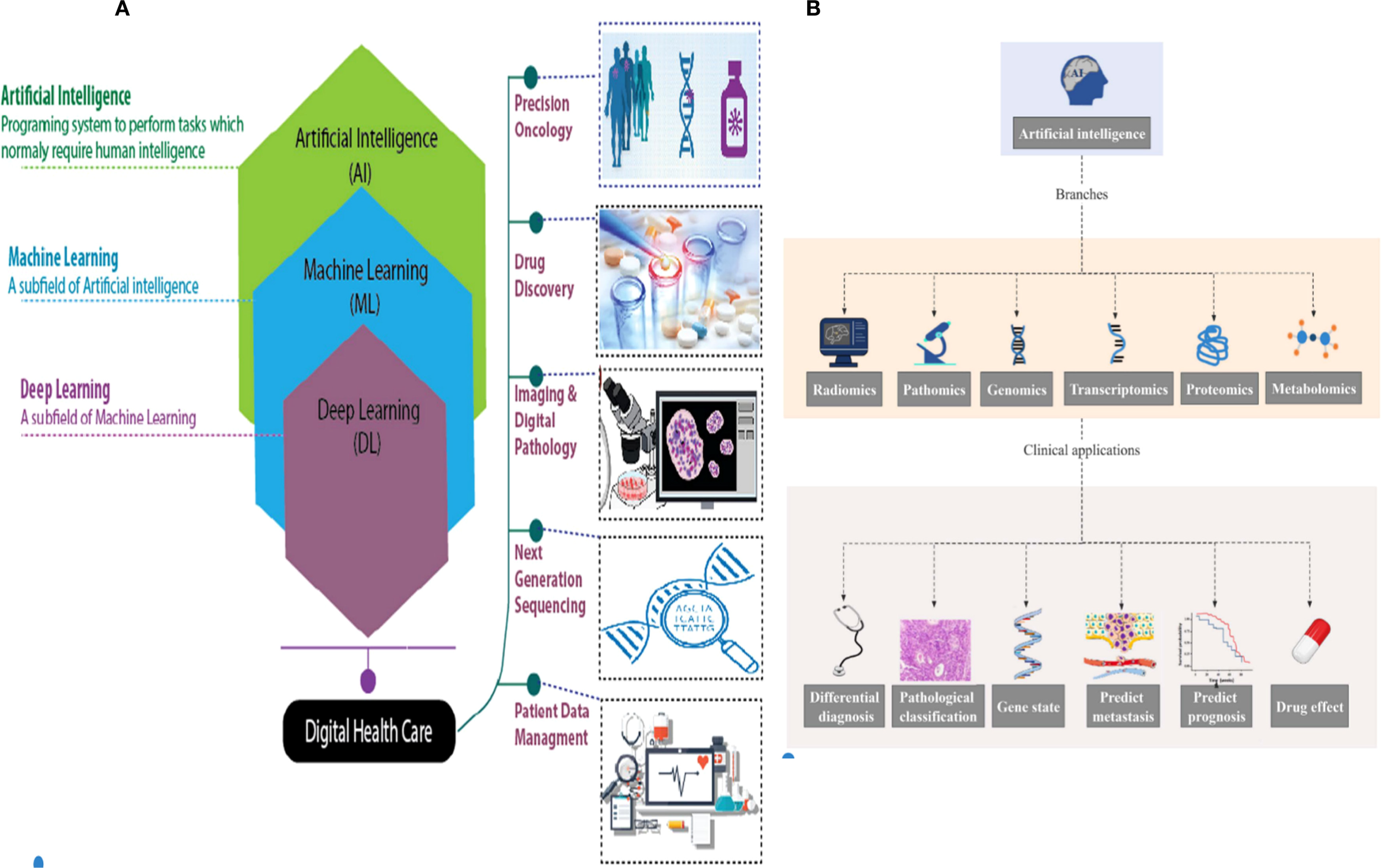 (A) Hierarchy of artificial intelligence (AI), machine learning (ML), deep learning (DL), and their applications in digital healthcare and oncology (e.g., precision oncology, drug discovery, and digital pathology) (3). (B) AI in omics (radiomics, pathomics, genomics, etc.) and related clinical applications (differential diagnosis, prognosis prediction, drug effect evaluation, etc.) (4).