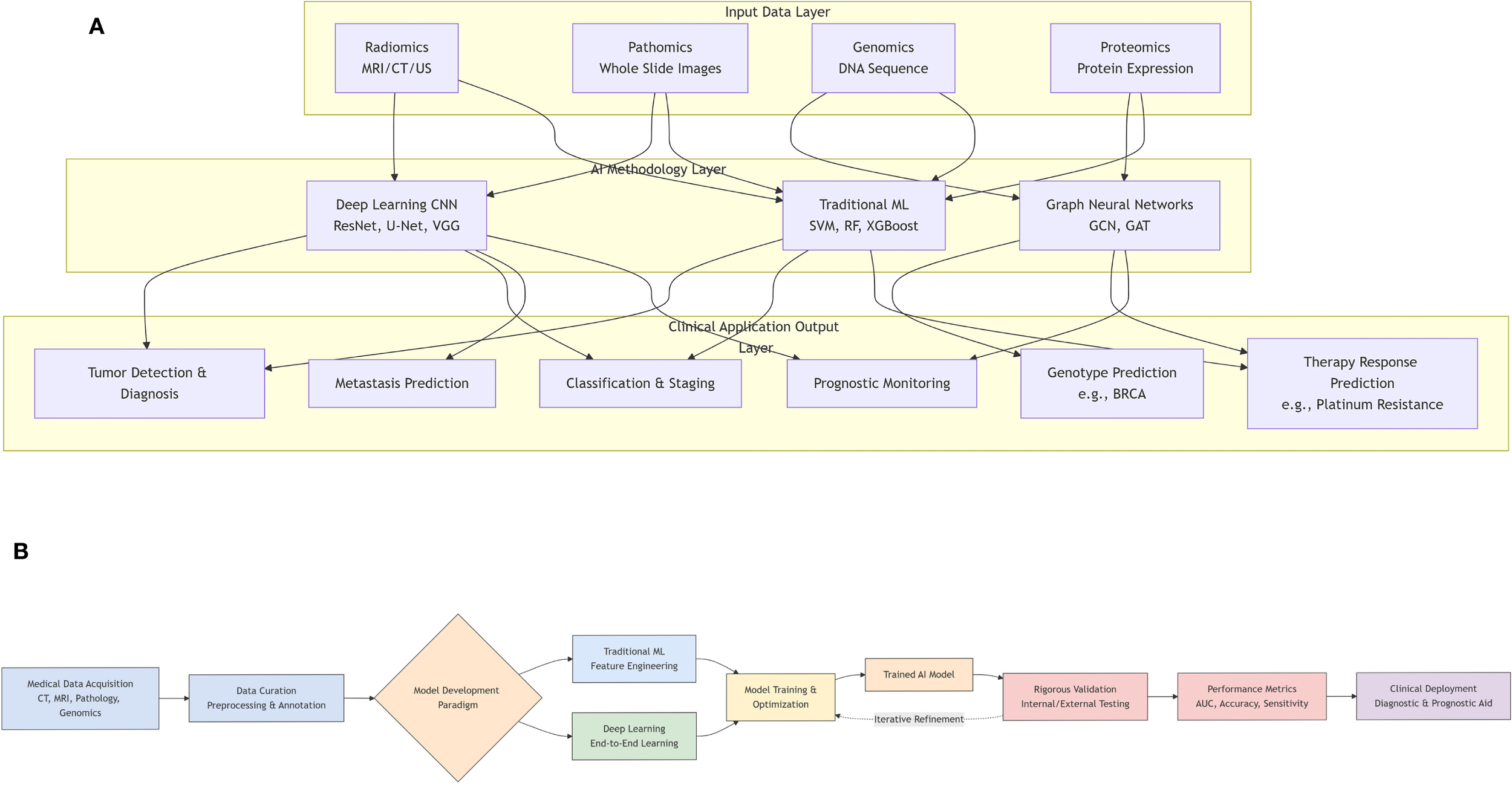 This review makes several key contributions to the field. First, it provides a comprehensive and up-to-date synthesis of the rapidly evolving application of deep learning across various imaging and omic modalities for gynecologic malignancies (Figure 2B). Second, it offers a detailed technical explanation of fundamental AI/ML/DL concepts and model architectures tailored for a clinical audience. Third, it critically examines not only the promising results but also the significant technical and clinical challenges hindering widespread clinical adoption. Finally, it discusses future directions to overcome these barriers and realize the potential of AI in improving gynecologic oncology care.