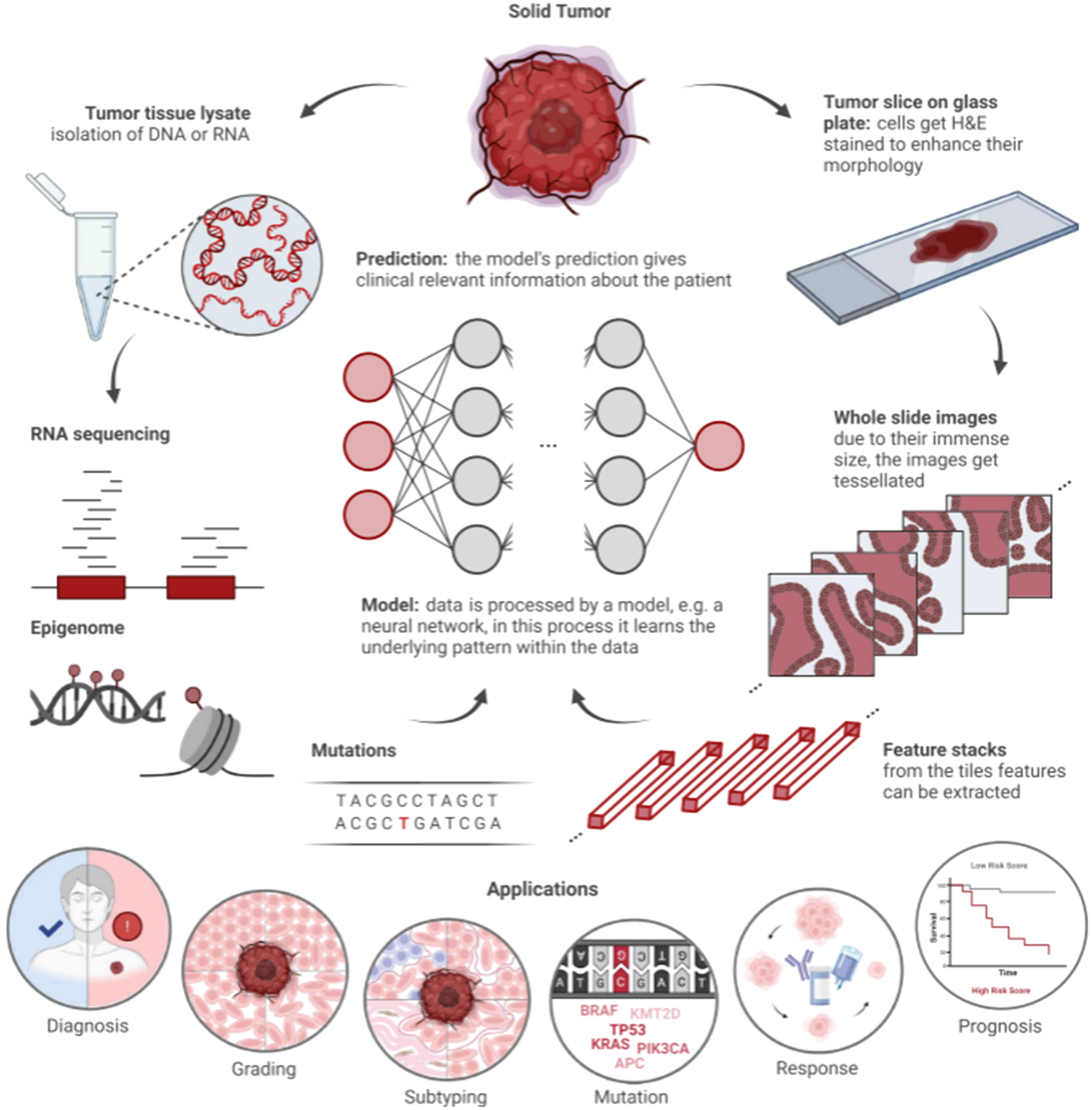Workflow of artificial intelligence (AI) in histopathology and clinical genomics (21). Solid tumors supply two data streams: 1) molecular data (DNA/RNA sequencing, epigenomic profiles, and genetic mutations) and 2) histopathological data (H&E-stained tumor slices, with whole slide images split into tiles for feature extraction). A model (e.g., neural network) analyzes these data to identify patterns, supporting applications including diagnosis, grading, subtyping, mutation detection, treatment response prediction, and prognosis.