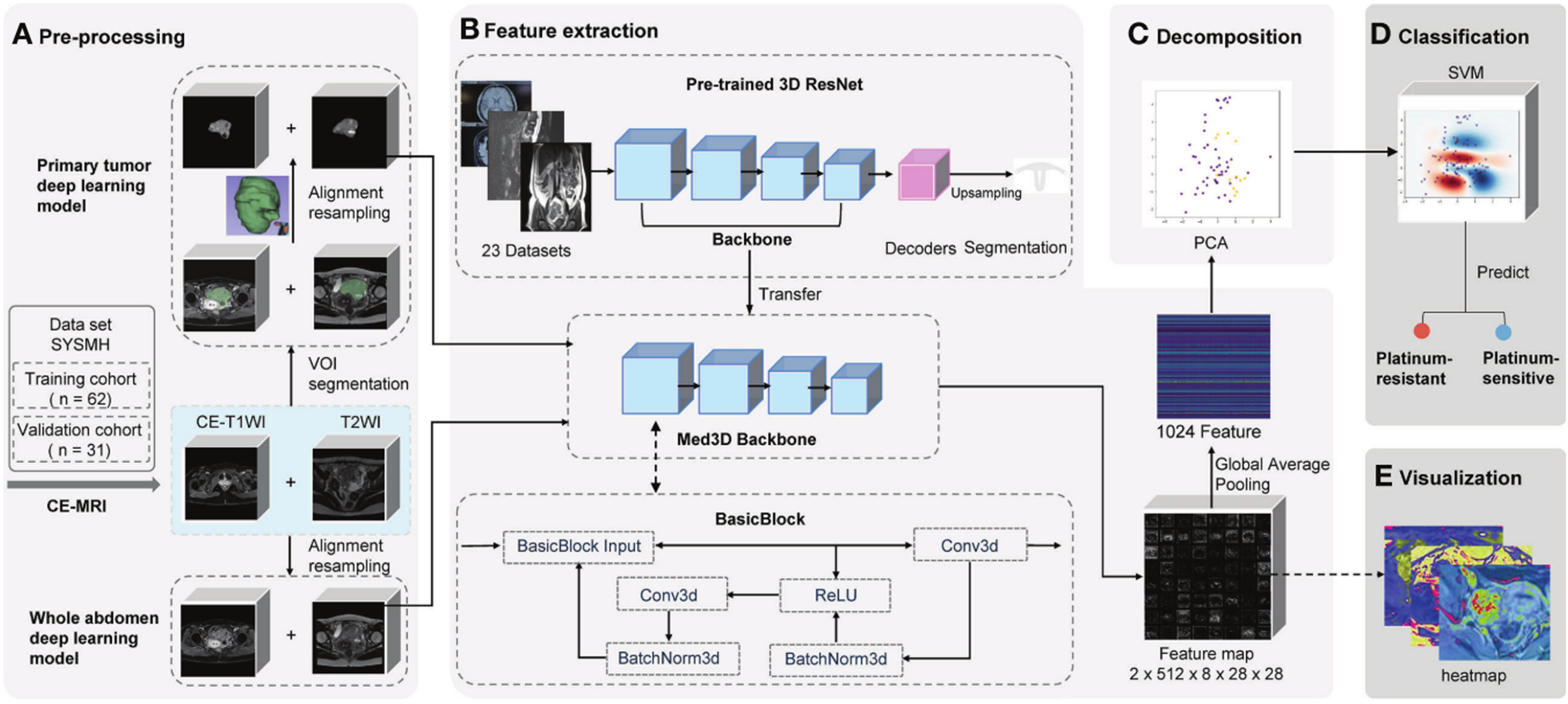 Schematic of deep learning frameworks for predicting platinum sensitivity using MRI (47). Two models use distinct volumes of interest (VOIs). 1) Primary tumor model: manually segmented primary tumor in contrast-enhanced T1-weighted imaging (CE-T1WI)/T2-weighted imaging (T2WI). 2) Whole abdomen model: entire abdomen volume (no manual segmentation). Workflow: (A) pre-processing (segmentation/registration/normalization of CE-T1WI/T2WI VOIs), (B) feature extraction via pre-trained 3D ResNet (transferred backbone + global average pooling to extract 1,024 features per patient), (C) principal component analysis (PCA) for feature decomposition, (D) support vector machine (SVM)-based platinum sensitivity prediction, and (E) heatmap visualization of convolutional layer feature maps.
