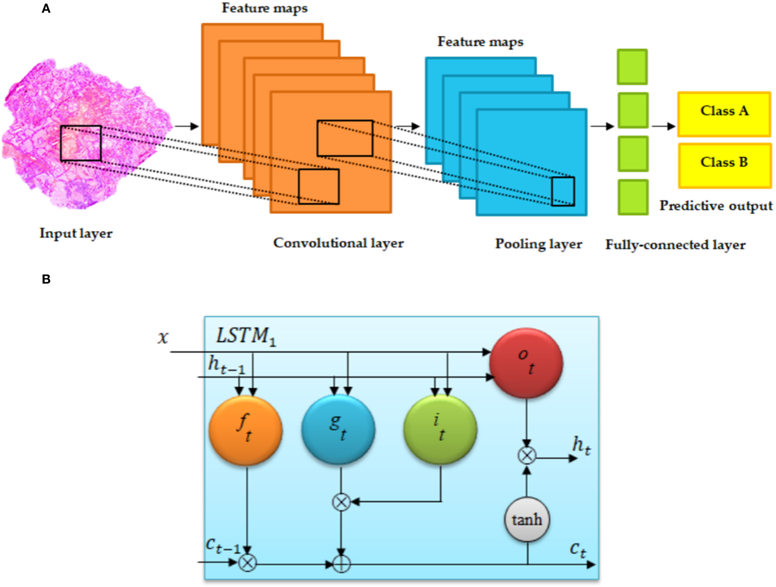 Basic architecture of (A) convolutional neural network and (B) long short-term memory (LSTM) (55). (A) Regular convolutional neural networks (CNNs) have convolutional, fully connected (FC), and pooling layers. (B) The memory cell c is controlled through a group of gate networks, including the following: f, forget gate network; i, input gate network; and o, output gate network.