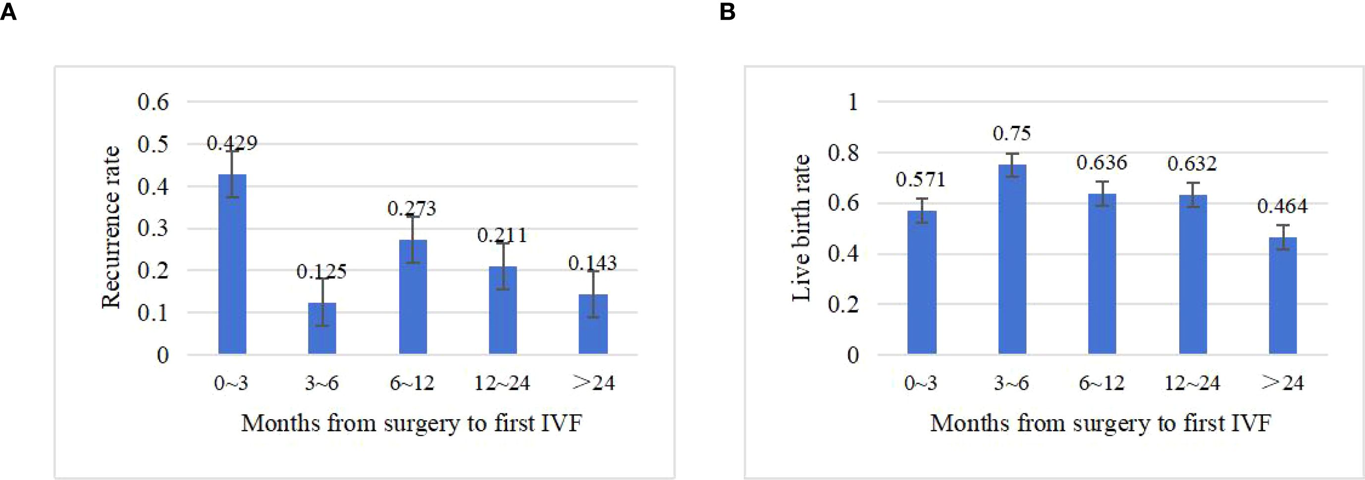 Figure 2. Impact of time to first IVF after surgery on clinical outcomes. (A) Recurrence rate by interval (months). (B) Live birth rate by interval (months).