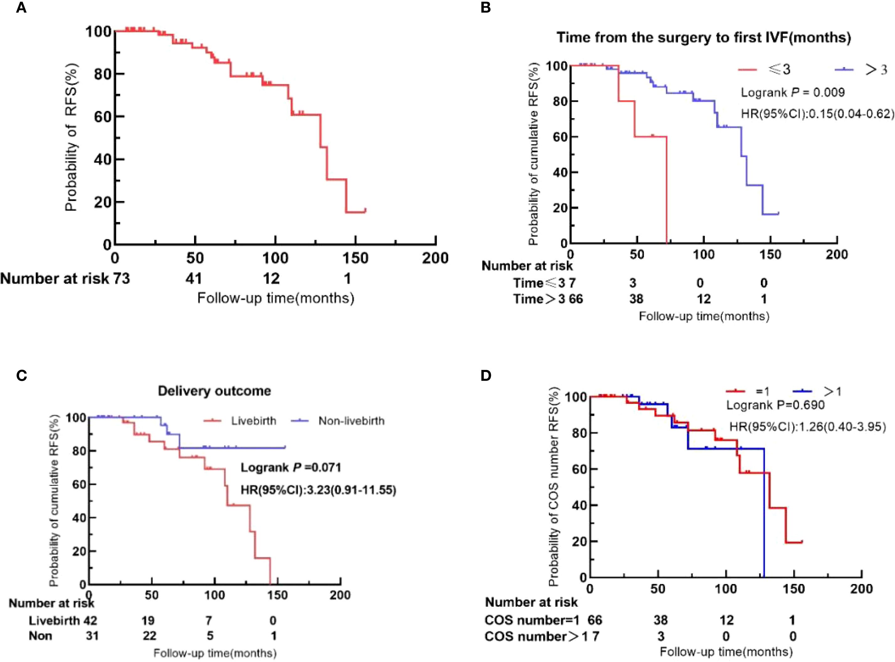 Figure 3. Recurrence-free survival (RFS) in BOT patients after IVF. (A) Overall cohort. (B) Time to first IVF after surgery (≤3 months vs. >3 months). (C) Live birth status. (D) Number of COS cycles (1 vs. >1).