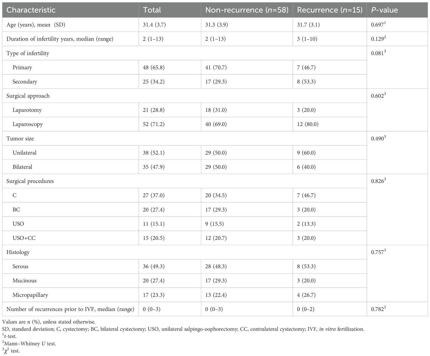 During the study period, 73 patients were followed up for 7.0–156.0 months, with a median follow-up of 61.0 months. Among these patients, 15 (20.5%) experienced recurrence and 58 (79.5%) remained recurrence-free. Recurrence interval following FSS and COS ranged from 10.0 to 130.0 months (median: 26 months). Table 1 summarizes the clinical and tumor characteristics of the recurrence group and the non-recurrence group. The mean age of the cohort was 31.4 (3.7) years, with no significant difference between the two groups (P =0.697). Of the 73 patients, 36 (49.3%) had serous BOTs, 20 (27.4%) had mucinous BOTs, and 17 (23.3%) exhibited micropapillary features. All patients underwent FSS surgery and were diagnosed at FIGO stage I. Twenty-one patients (28.8%) underwent laparotomy, while 52 (71.2%) underwent laparoscopic surgery. Regarding surgical procedures, 27 patients (37.0%) had unilateral cystectomy (C), 20 (27.4%) had bilateral cystectomy (BC), 11 (15.1%) underwent unilateral salpingo-oophorectomy (USO), and 15 (20.5%) had USO with contralateral cystectomy (CC). There was no significant difference in surgical approach (P =0.602), surgical procedures (P =0.826), histopathological subtype (P =0.757), or prior recurrences before IVF (P =0.782) between the recurrence and non-recurrence groups.