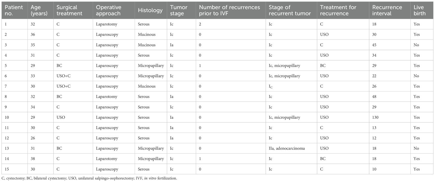 Detailed characteristics of the 15 relapsed patients are presented in Table 2. One patient who underwent mild ovarian stimulation progressed to stage IIA ovarian mucinous cystadenocarcinoma. She received complete staging surgery followed by six cycles of chemotherapy and remained disease-free. The remaining 14 patients retained their BOT status without progression or recurrence.