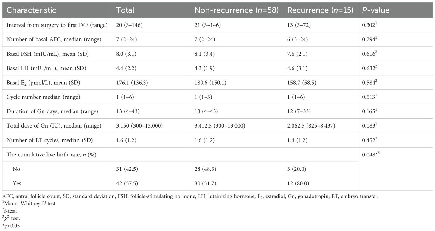 A total of 123 COS cycles were performed in 73 patients, followed by 69 fresh and 47 frozen embryo transfers (Table 3). The median number of COS cycles was 1 (range: 1–6), with an average of 1.6 (1.2) embryo transfers per patient. There were no significant differences in the number of COS cycles between groups (P=0.513). The median total dose of Gn was 3,150 IU (range: 300–13,000 IU), and the median duration of Gn was 13 days (range: 4–43 days), with no significant differences (P=0.183 and 0.165, respectively). Overall, 42 of 73 patients achieved live births via IVF, resulting in a cumulative clinical pregnancy rate of 57.5% (42/73). Notably, the cumulative live birth rate was significantly higher in the recurrence group (80.0%, 12/15) than in the non-recurrence group (51.7%, 30/58; P =0.048).