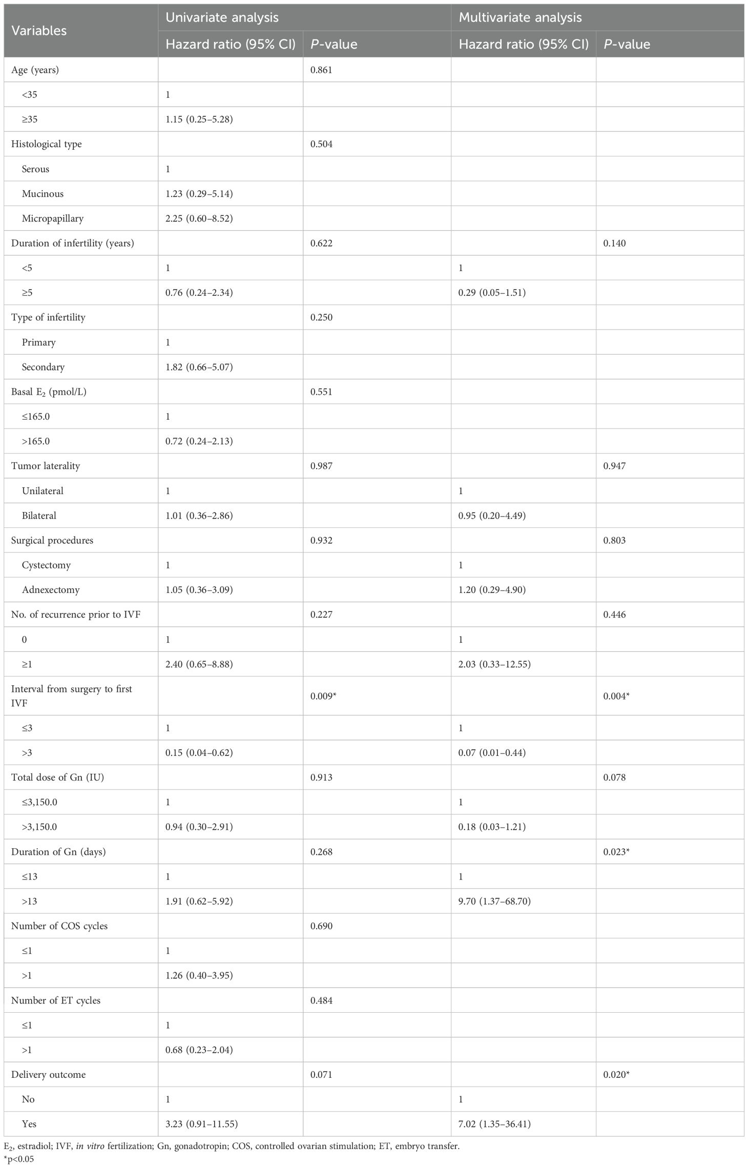 As detailed in Table 4, continuous variables were categorized based on initial patient characteristics, clinical judgment, and relevant literature. Univariate analysis showed that initiating IVF within 3 months after surgery was significantly associated with higher tumor recurrence. In contrast, the number of COS cycles, the number of embryo transfers, basal E2 levels, total dose of Gn, and duration of Gn did not significantly influence recurrence.