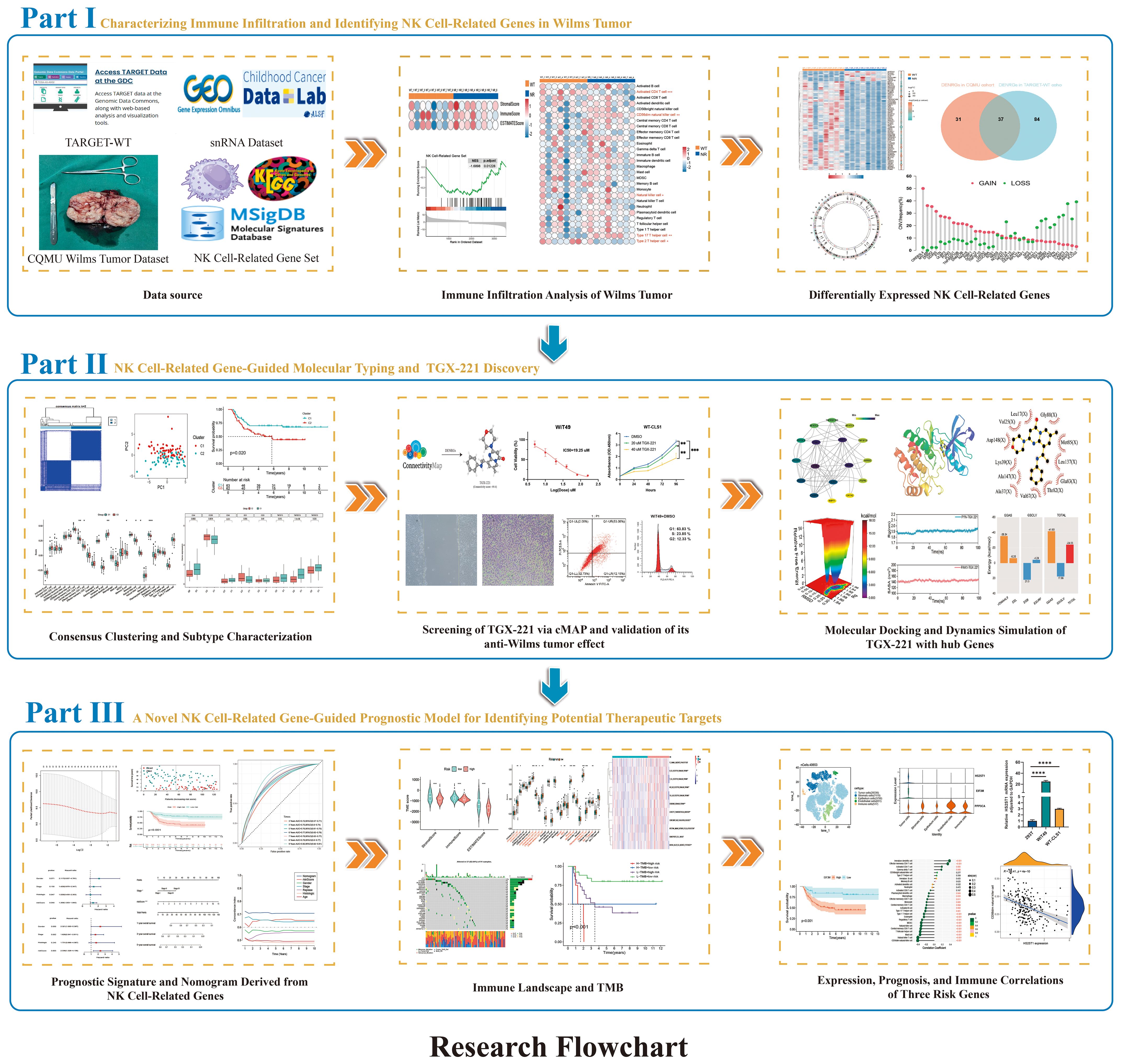 Research flowchart divided into three parts. Part I focuses on characterizing immune infiltration and identifying NK cell-related genes in Wilms tumor, including data sources, immune analysis, and gene expression. Part II discusses NK cell-related gene-guided molecular typing and TGX-221 discovery, emphasizing clustering, drug screening, and molecular docking. Part III presents a prognostic model for therapeutic targets, detailing prognostic signatures, immune landscape, and gene correlations. Each section contains visual representations like charts, graphs, and molecular diagrams.