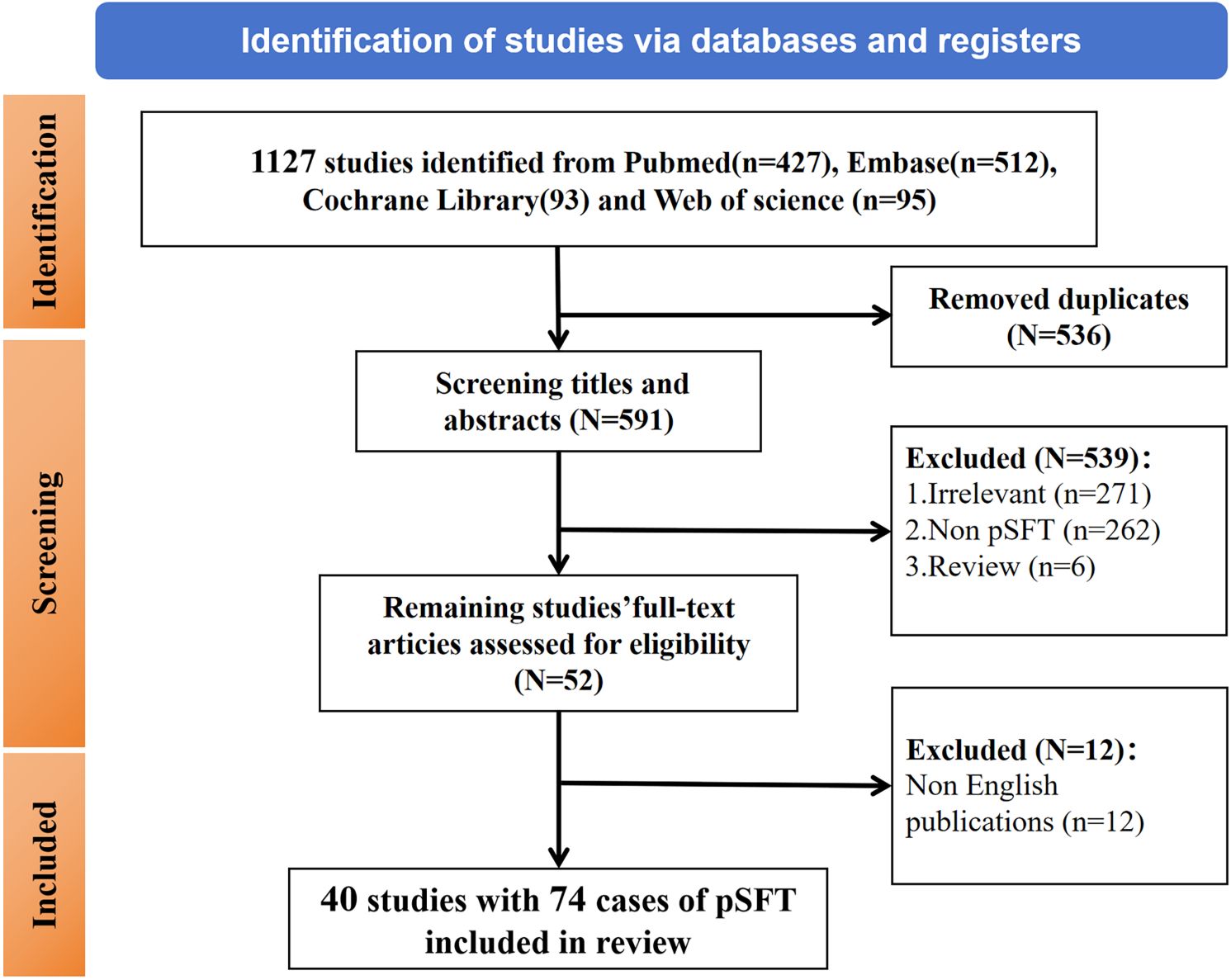 Methods and case report: This study reports a additional case of pSFT. Subsequently, we performed a systematic review of PubMed, Web of Science, Cochrane Library, and Embase databases for potentially relevant articles on pSFT from inception of database to October 2024. Two researchers independently screened eligible literature, extracted data, and summarized data.