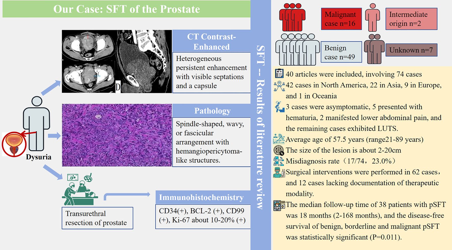 Results: A 71-year-old male patient presented to our hospital with a three-month history of dysuria, and prostate-specific antigen (PSA) was within the normal range. After transurethral prostatectomy, the histopathological diagnosis was pSFT. During three years of outpatient follow-up, the patient had no recurrence. Ultimately, forty literatures were included with 74 cases of pSFT, and age ranged from 21 to 89 years (mean 57.5 years, median 61.5 years). There were 42 cases (56.8%) in North America, 22 cases (29.7%) in Asia, 9 cases (12.2%) in Europe, and 1 case (1.4%) in Oceania. The PSA values were within the normal range in almost all cases, and about 47.3% (35/74) cases underwent ultrasound, magnetic resonance imaging or CT examination before surgery. Notably, the most characteristic imaging biomarkers of the tumor were continuous and gradual enhancement from the periphery to the center with visible separation and capsule. The malignancy rate was 21.6% (16/74). There was no significant difference between benign and malignant pSFT of the lesion size (P > 0.05). Meanwhile, STAT6 and/or NAB2-STAT6 fusion genes were very sensitive biomarkers for pSFT. The median follow-up time of 38 patients with pSFT was 18 months (2–168 months), and the disease-free survival of benign, borderline and malignant pSFT was statistically significant (P=0.011).