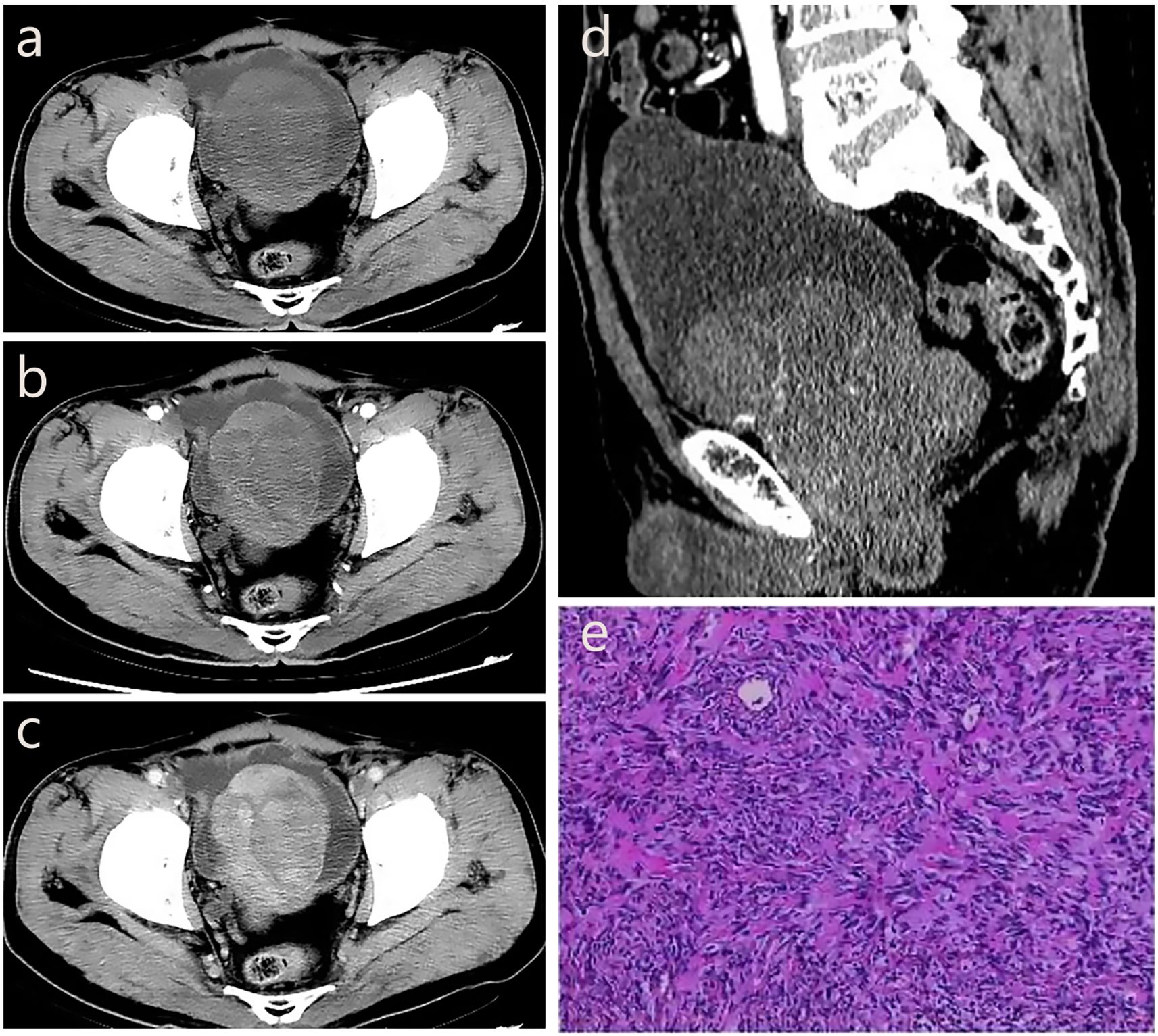 Figure 3. The CT imaging biomarkers and pathological of our pSFT. (a, d) CT shows an increase in prostate volume, with a mass of approximately 4.5cm × 5.8cm protruding into the bladder, with clear boundaries and low density. (b) CT enhanced scan shows mild enhancement in the arterial phase, which is flocculent and uneven. (c) In the venous phase, the tumor shows continuous and gradual enhancement from the periphery to the center, with visible separation and capsule. (e) Pathological examination showed a spindle cell tumor of the prostate, and the tumor cells were spindle-shaped, wavy, storiform or fascicular arrangement, and hemangiopericytoma-like structure could be seen and nuclear division was clear to see, spindle-shaped or oval.