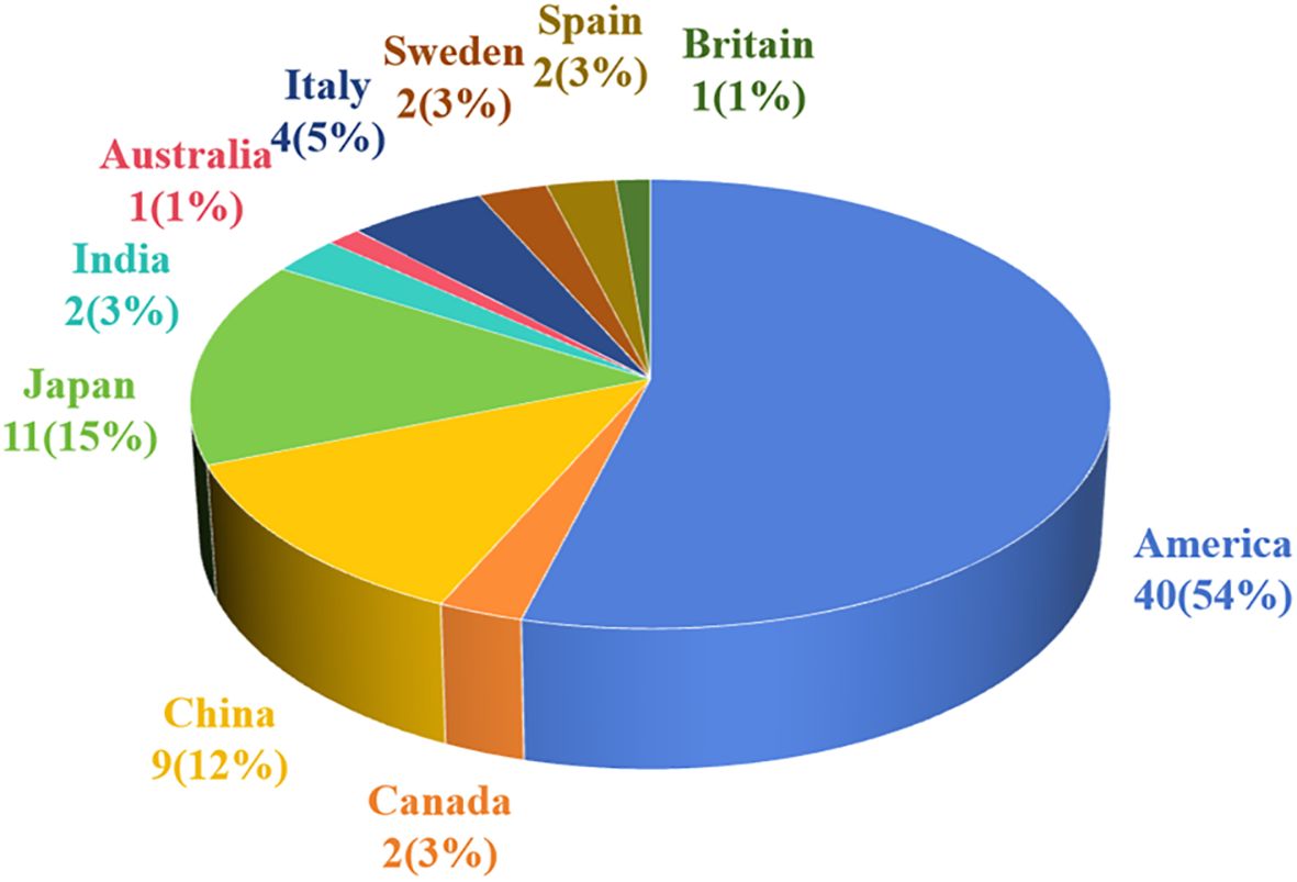 Notably, 74 cases of pSFT have been reported, including 42 cases (56.8%) in North America, 22 cases (29.7%) in Asia, 9 cases (12.2%) in Europe, and 1 case (1.4%) in Oceania. The regional distribution was shown in Figure 4. Additionally, pSFT varies in size (2–20 cm) and most reported cases are larger than 5 cm. Moreover, according to the statistics of retrieved literature, there were 2 cases of pSFT with intermediate origin and 7 cases of pSFT with unknown benign or malignant. On the one hand, the reported size of benign cases of pSFT were about 30/49 (61.2%), with an average size of 8.9 cm. On the other hand, the reported size of malignant cases of pSFT were about 15/16 (94.0%), with an average size of 11.3 cm. There was no significant difference between benign and malignant pSFT regarding lesion size (P > 0.05).